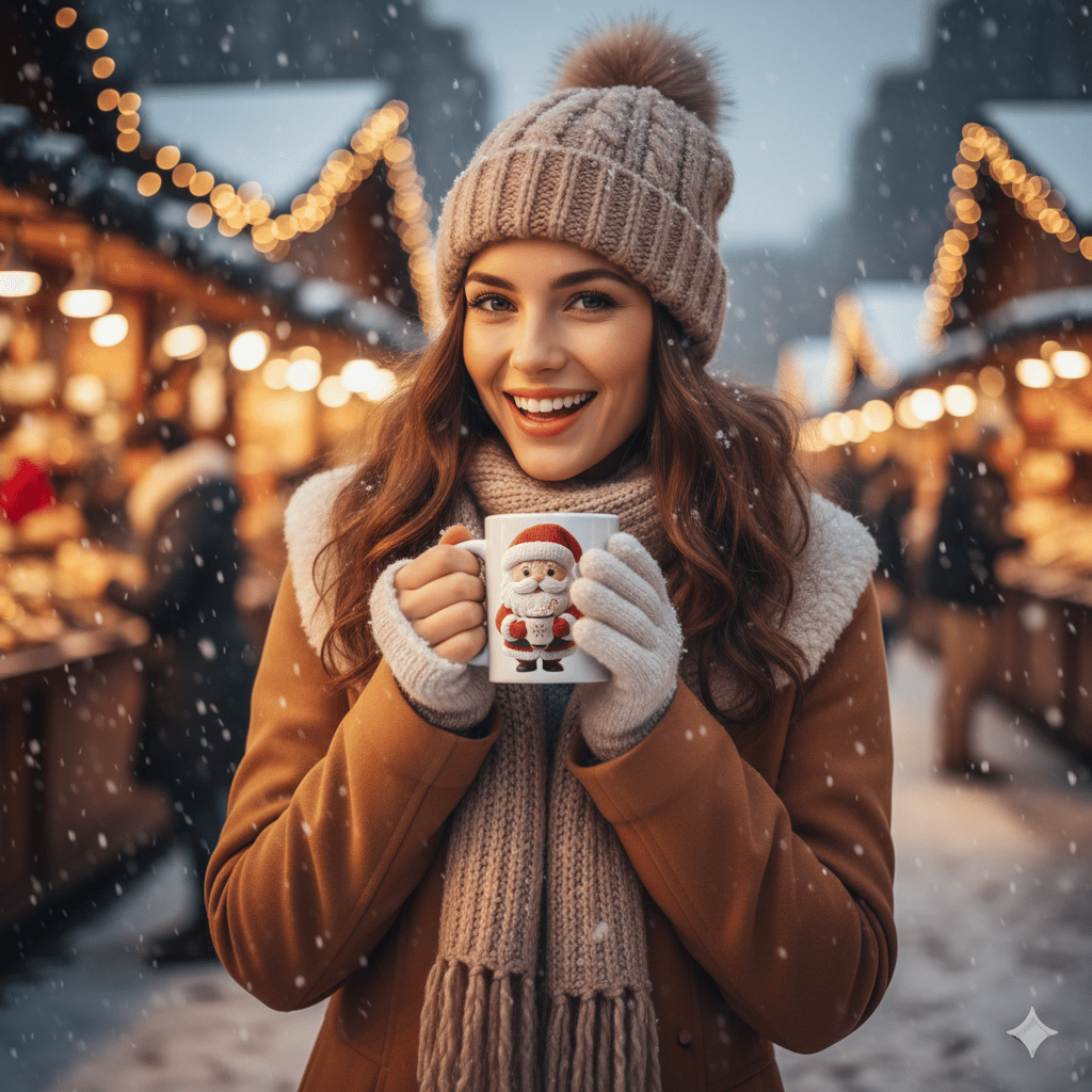 Santa is holding a festive hot chocolate with whipped cream, sprinkles, and a candy cane - perfect for holiday party designs!