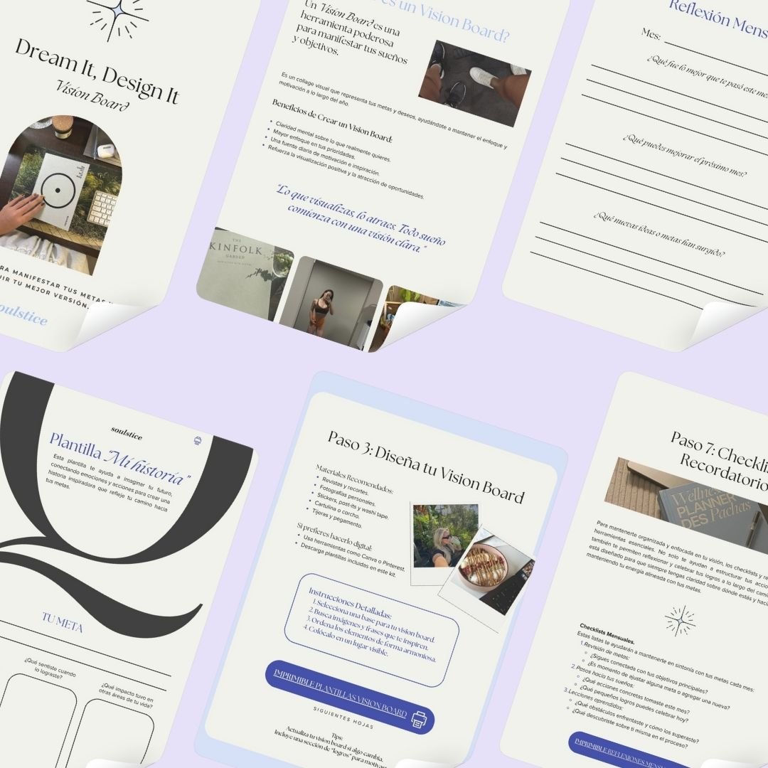 - Organizadores y secciones específicas para definir tus metas en todas las áreas de tu vida. Crea un vision board claro y poderoso que te inspire diariamente. 🖊️