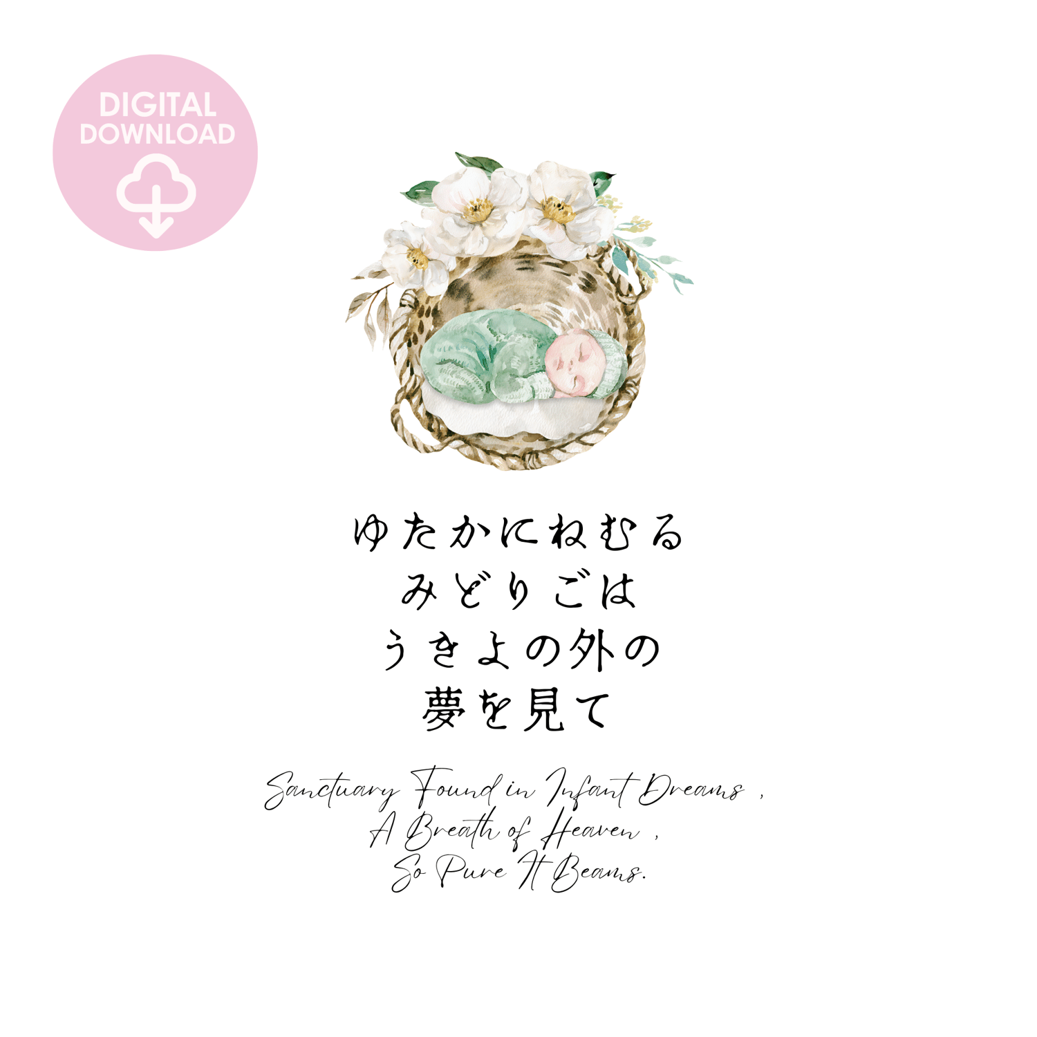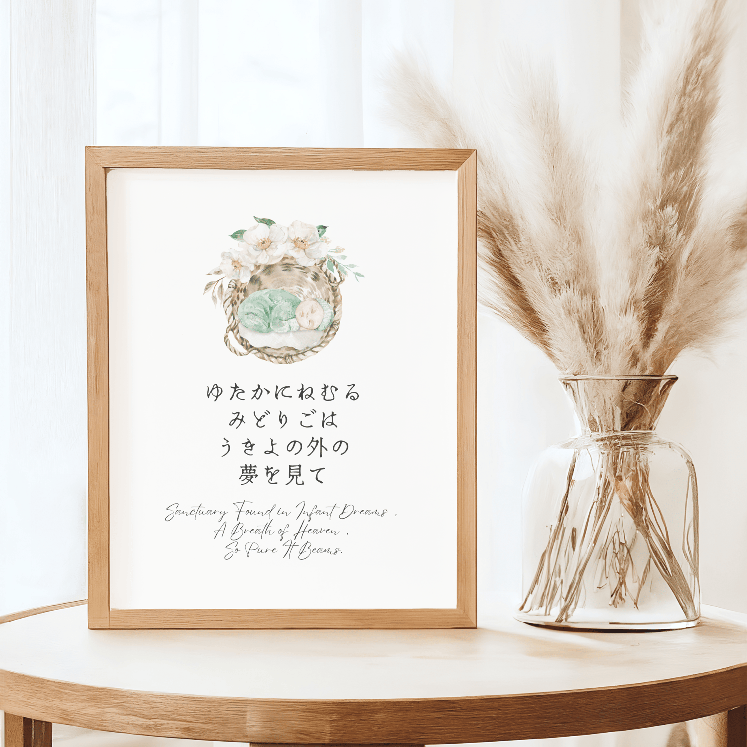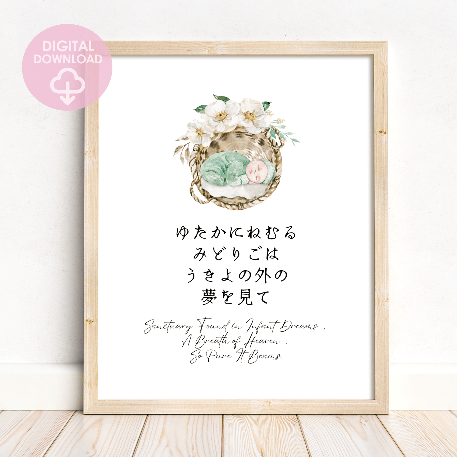 Transform your baby's room with this enchanting wall art, featuring a delicate watercolor of a peacefully sleeping baby. Accompanied by a classic poem quote from Japanese poet Kitamura Tokoku, presented in both Japanese and English, this artwork adds a touch of timeless beauty and serenity to any nursery. Perfect for creating a warm and inviting atmosphere, this piece is ideal for baby girl nursery wall decor.