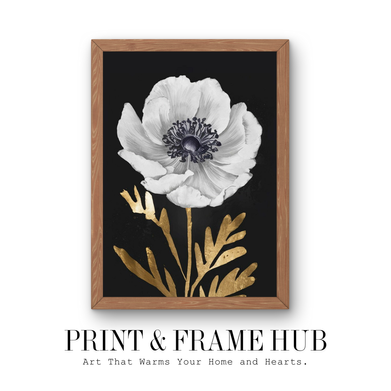 Captivating artwork combining a white flower with a dark background and gold accents. This piece blends simplicity and luxury, making it an ideal addition to any wall with its timeless charm.