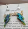 These fierce statement earrings feature a vibrant lime green UV lightning bolt, pulsing with electric energy and dusted in radiant purple glitter that shimmers under the light. Each bolt is joined by natural citrine crystal chips, known for their uplifting, energising vibes – perfect for queens who own their power.