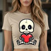 Bring your Halloween projects to life with this striking digital design of a skeleton holding a red heart, ideal for those who love art with a dark and original touch. Perfect for sublimation, vinyl, printing, crafts, decorations, or personalized products.