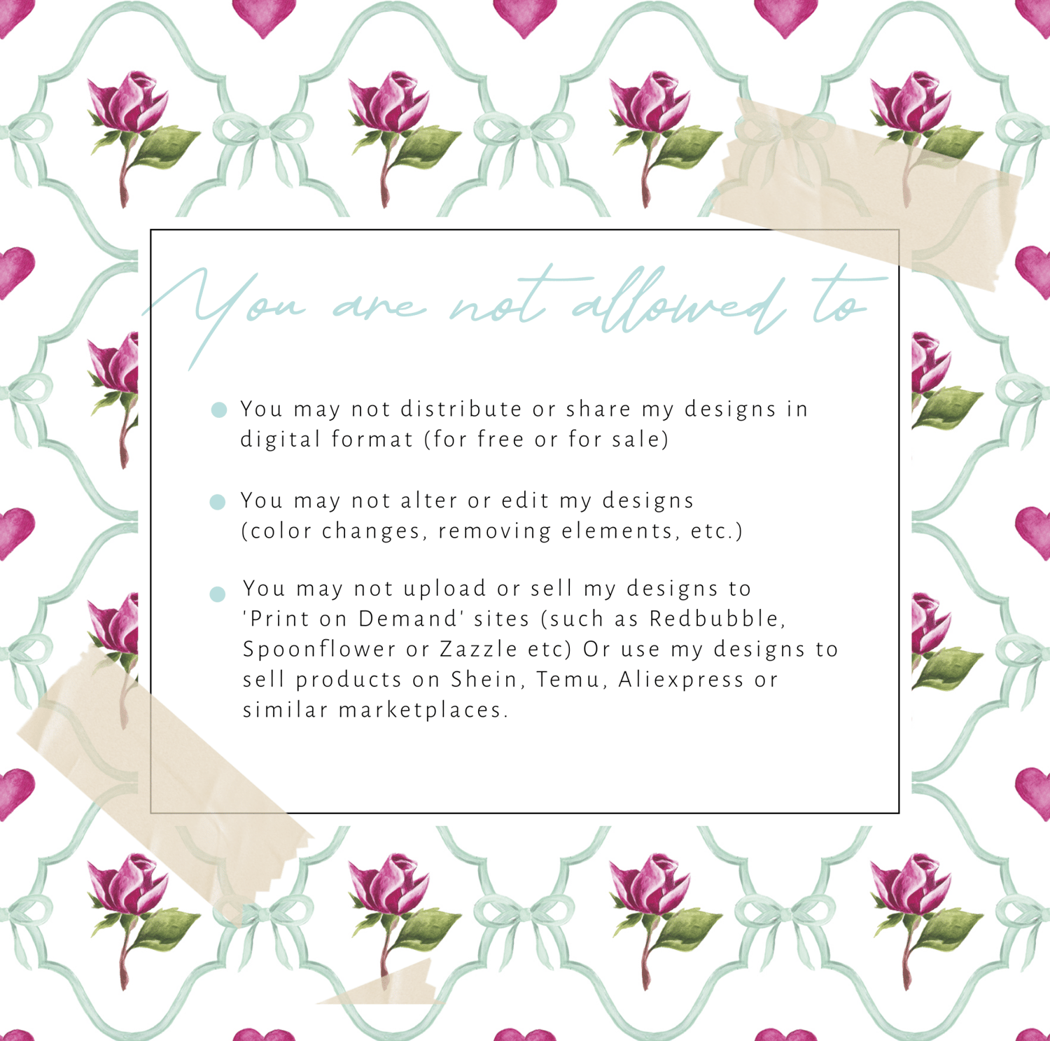 You may not upload or sell my designs to 'print on demand sites' (Such as Redbubble, Spoonflower or Zazzle etc) Or use my designs to sell products on Shien, Temu, AliExpress or other marketplaces. This does not include uploading files to external printing companies if you do not have access to an edible printer at home.