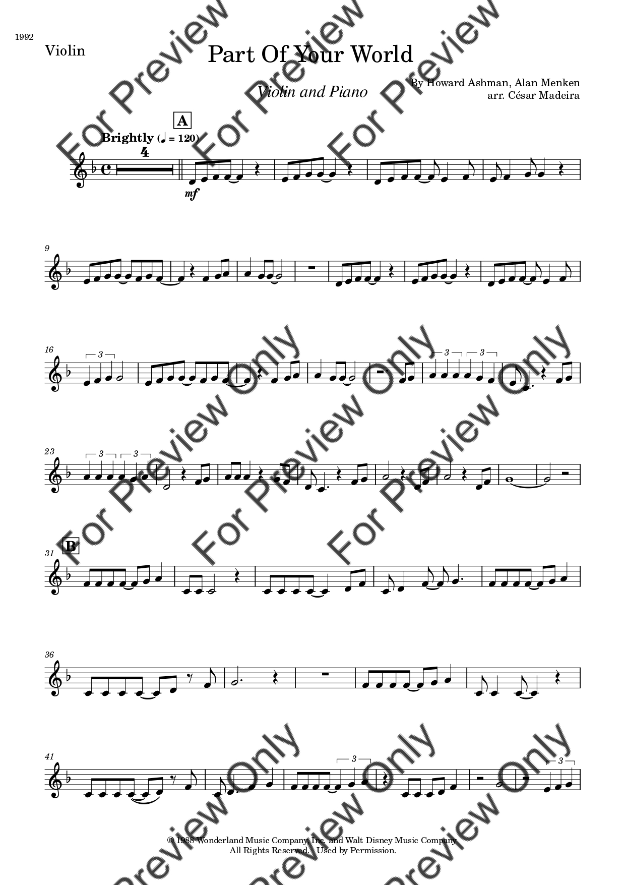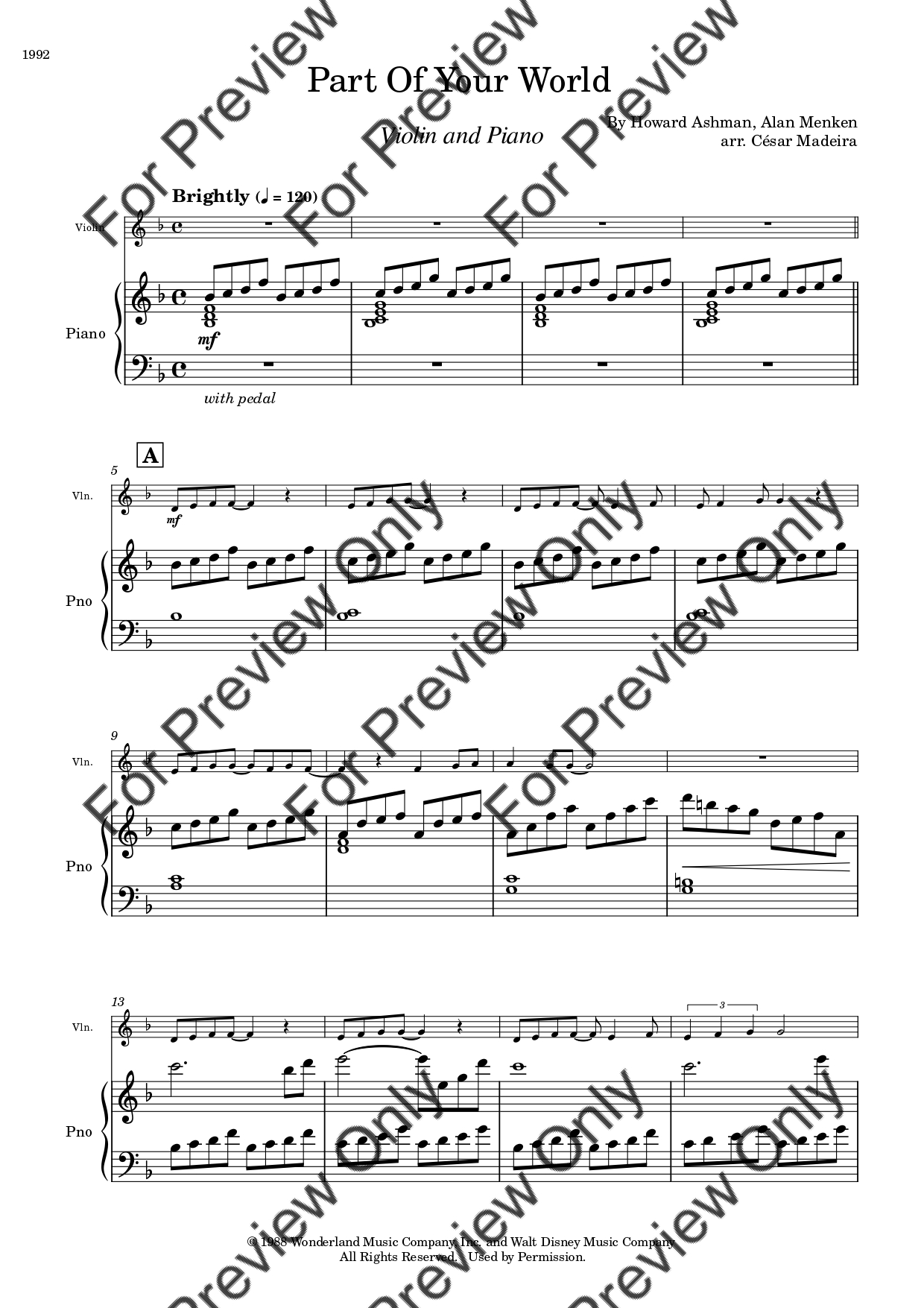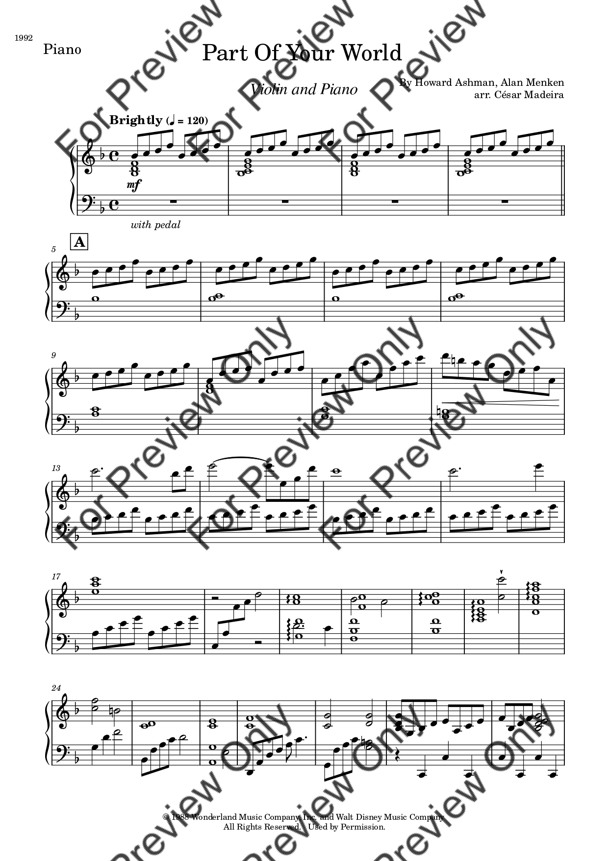 Part Of Your World from The Little Mermaid by Alan Menken. Arrangement for Violin and Piano. With Full Score and Individual Parts. Have fun!
