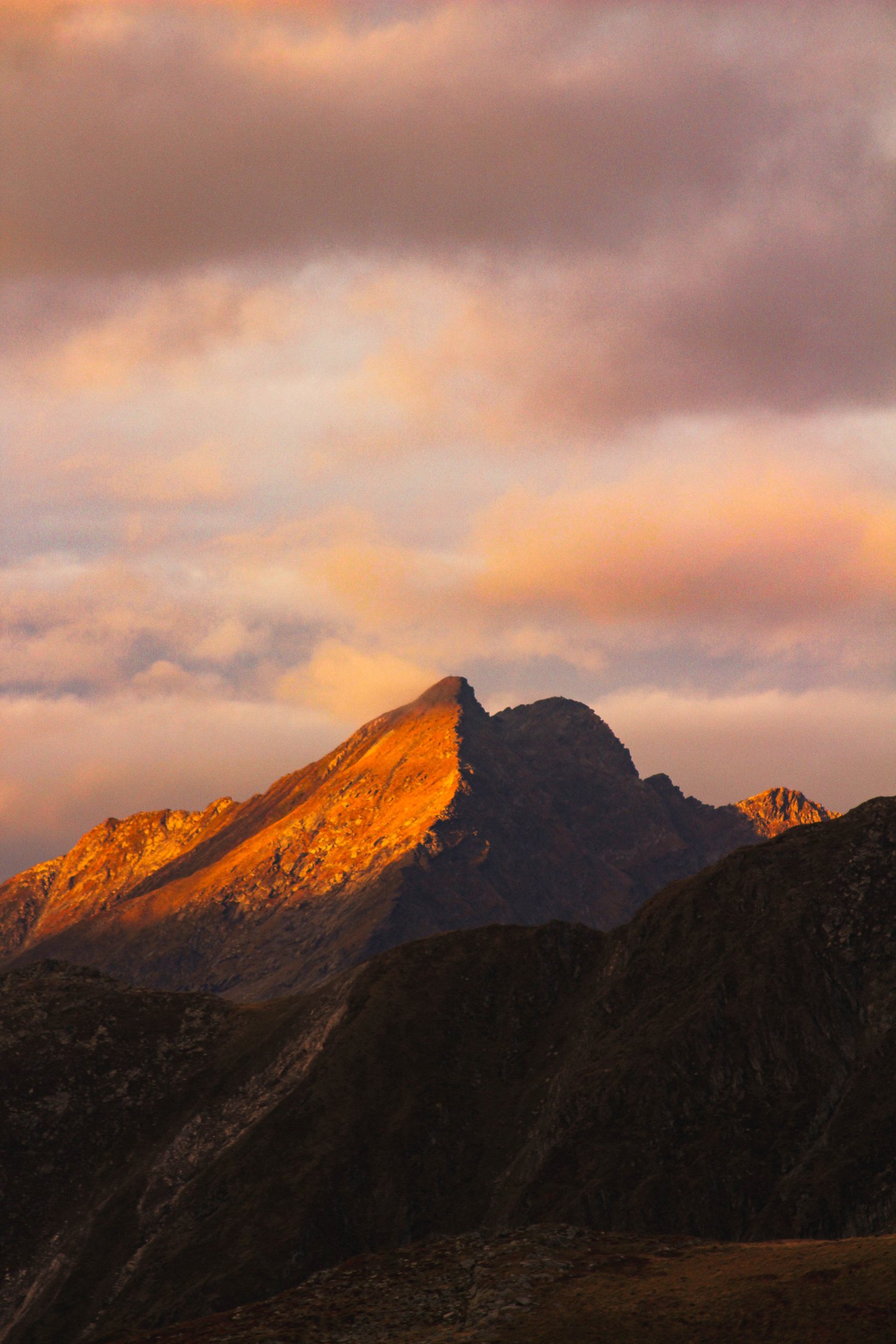 Le ciel chargé de nuages prenait lui aussi ces premiers reflets du matin, et dans cette obscurité qui se déchirait, on ne voyait plus que lui. Ce sommet-là. Celui qui s’éveillait en premier, comme un géant chargé d’ouvrir la journée pour toute la chaîne de montagnes.