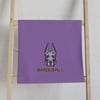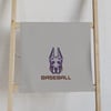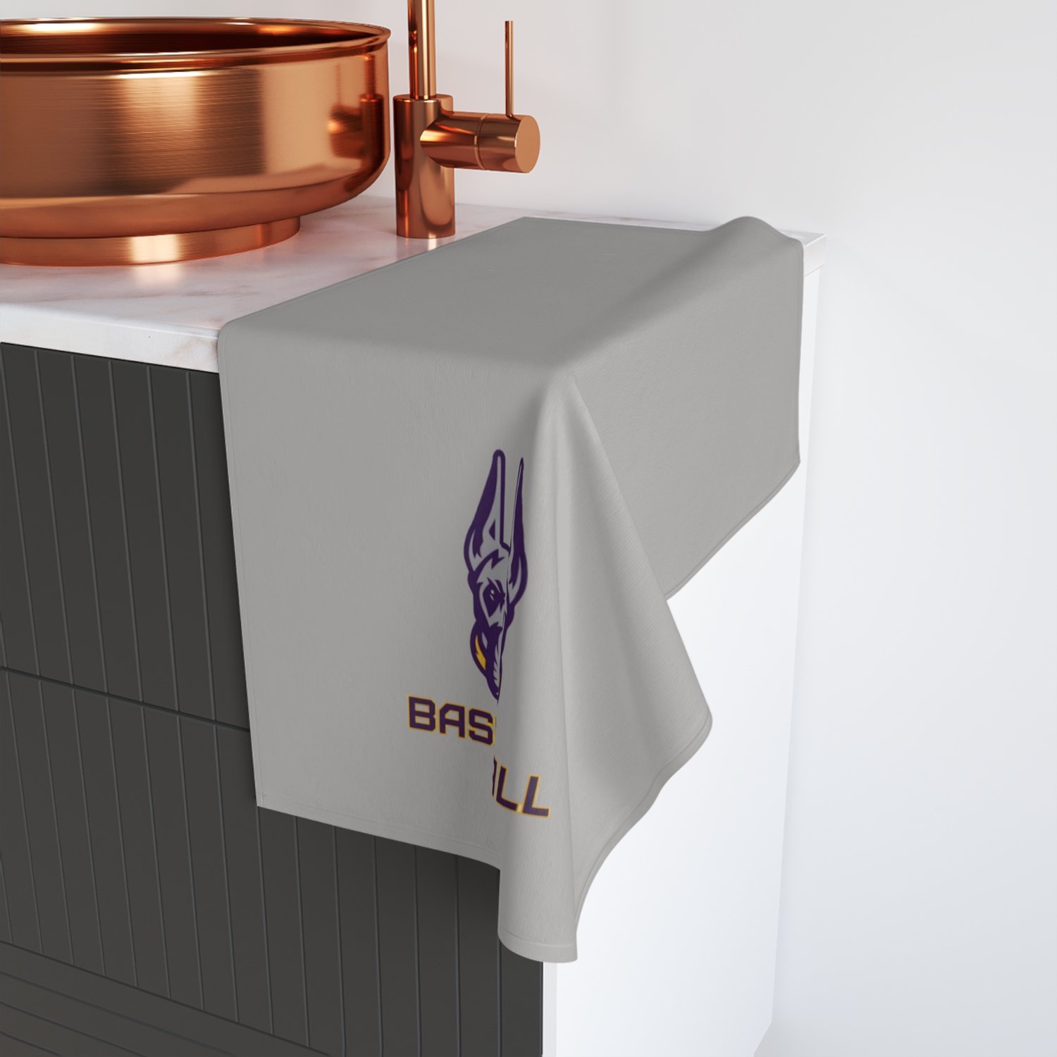 - Neutral gray base with purple and brown team-style logo