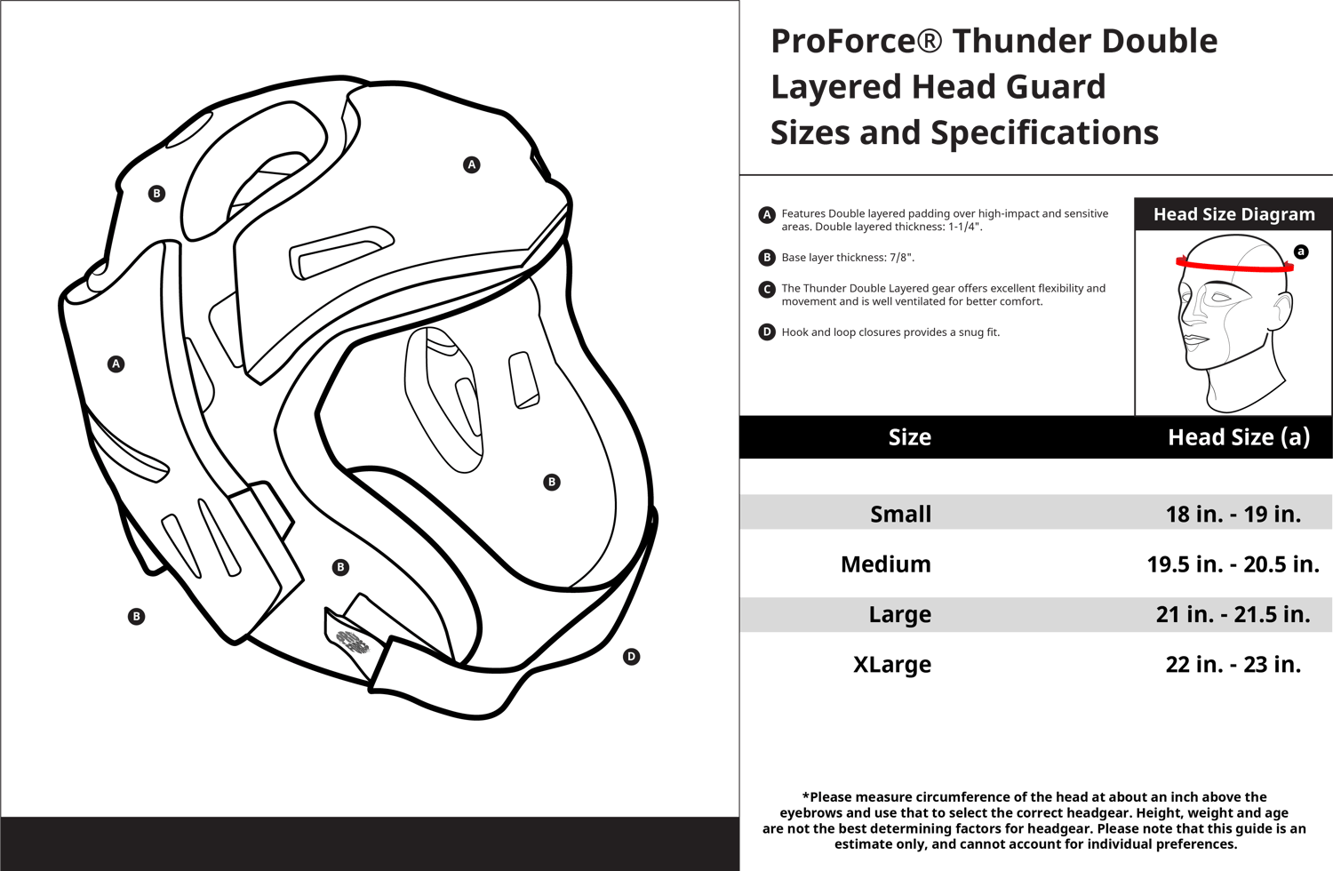 "Thunder" gear line features double-layered padding over high-impact and sensitive areas such as knuckles, instep, and ears. The Thunder Double Layered gear offers excellent flexibility and movement and is well-ventilated for better comfort. Hook and loop closures provide a snug fit. Sized to fit children through adults.