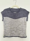 The rest of the body is knit using color B until the hem. The neck, sleeves and bottom hem of the tee are finished with folded hem using color A.