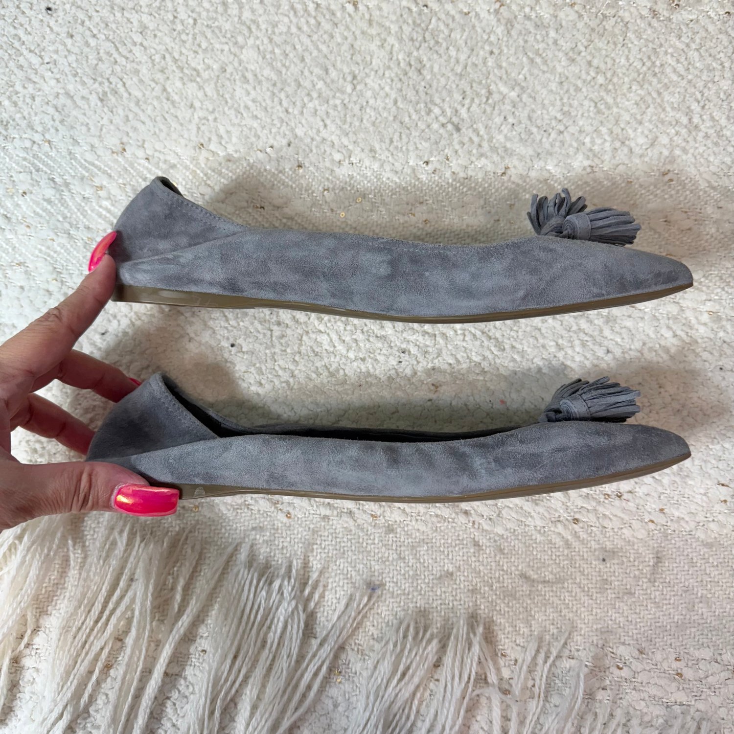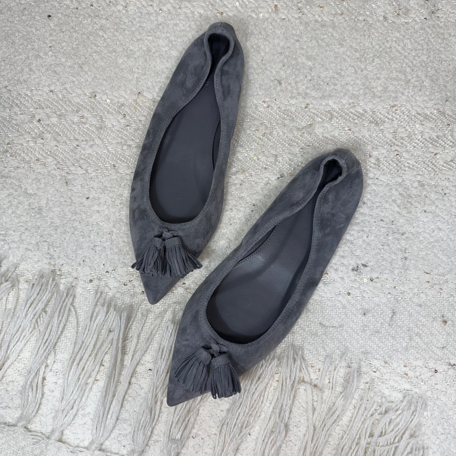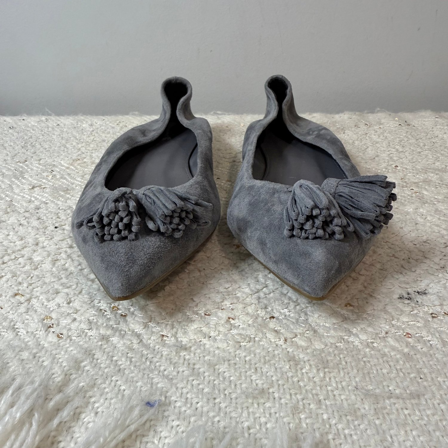 J.Crew gray suede pointed toe flats with tassels at the toes.