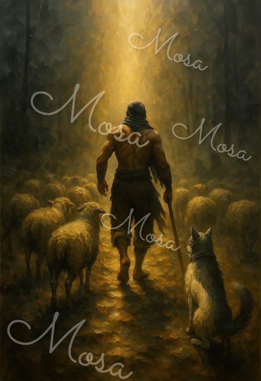 In the heart of a dark, dense forest, a muscular shepherd walks barefoot among his flock, illuminated by a divine beam of golden light descending from above. His back is strong, his presence calm yet commanding. Beside him walks a loyal dog, alert and focused, sharing the burden of leadership and protection.