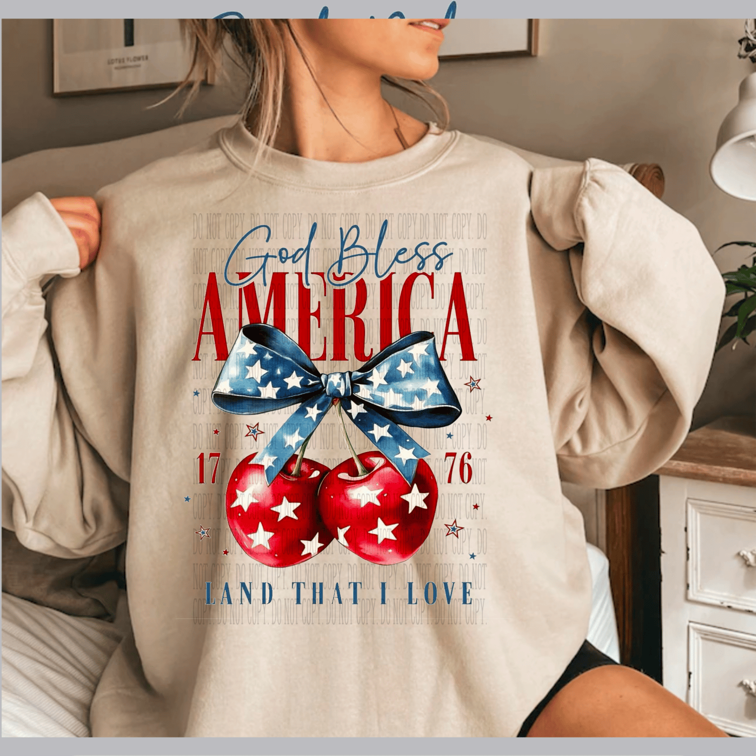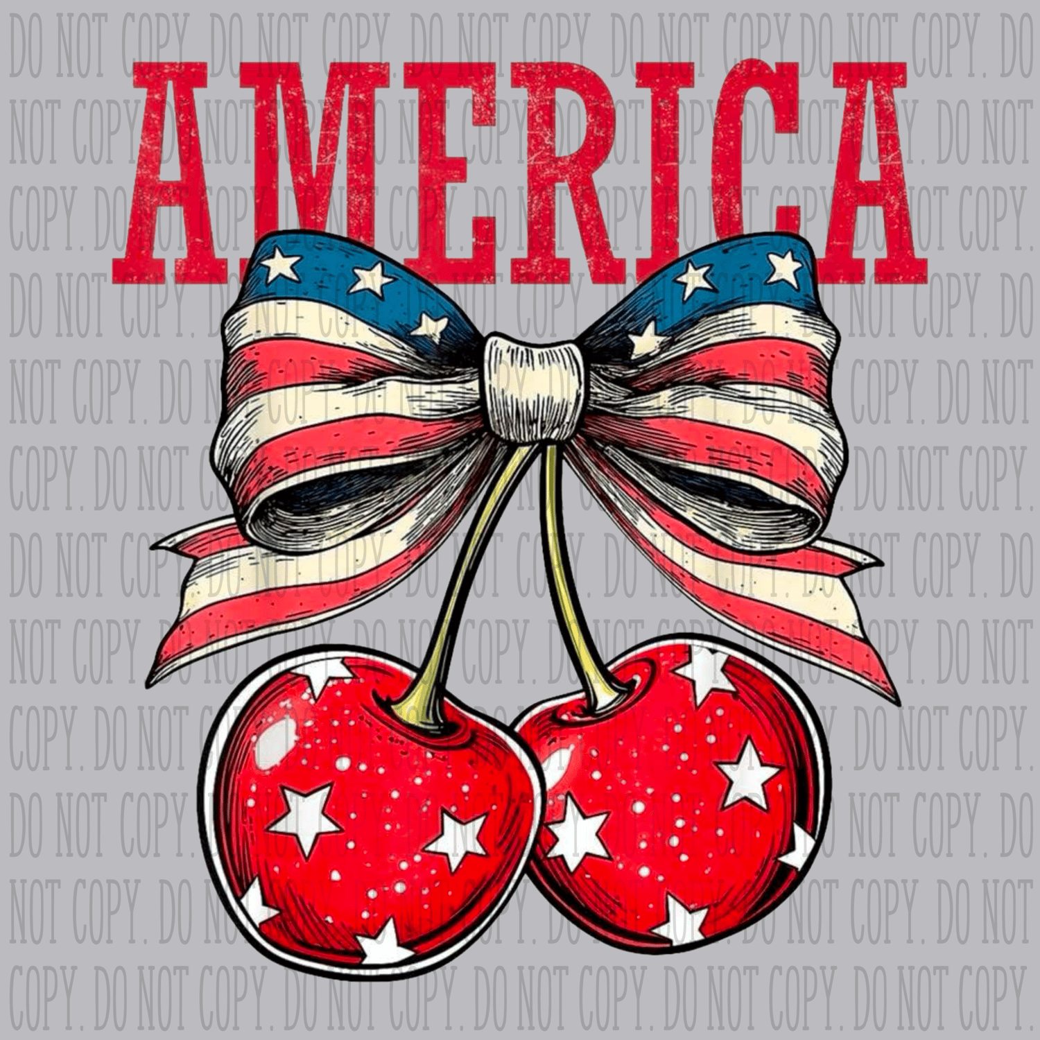 Featuring bright red cherries with star details tied together by a red, white, and blue American flag bow, this design is perfect for creating eye-catching patriotic apparel and gifts.