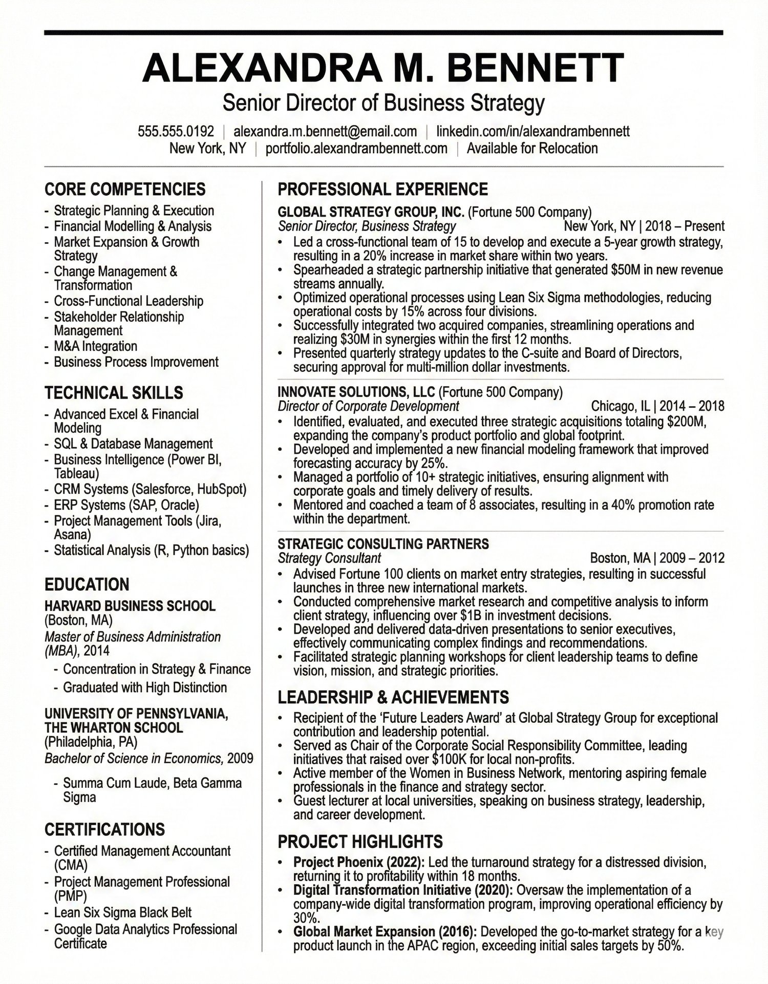 - Executive-Optimized Layout: A logical two-column (35/65) split prioritizes credentials and provides clear narrative flow for professional experience.