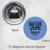 Bottle Opener Magnet is 3" round. Imaged on the front side and on the back side is a magnet and bottle opener. These magnets are great for the kitchen, BBQ area or make excellent gifts.
