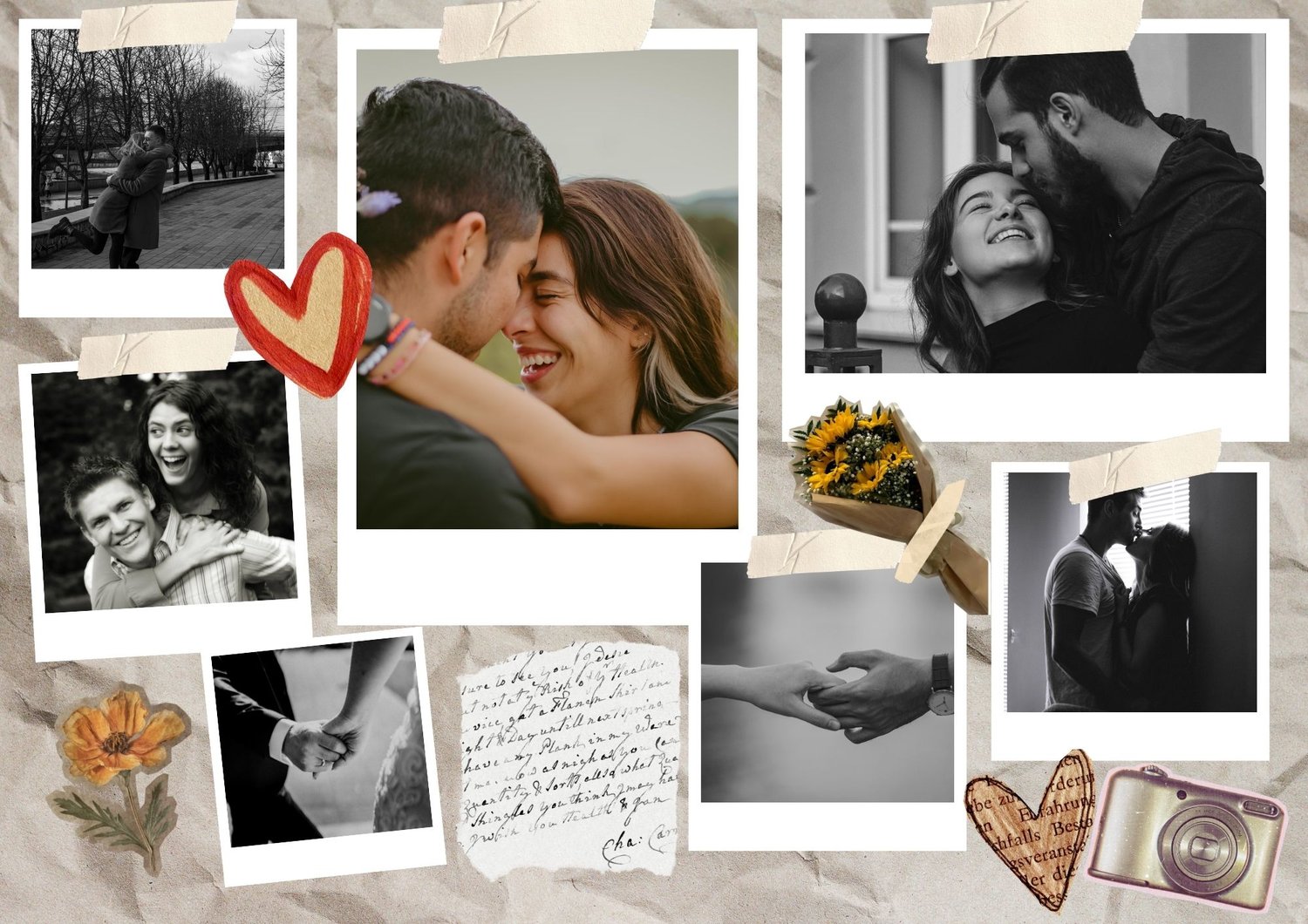 - Multiple collage styles: clean minimalist grids, scrapbook cut-outs, heart stickers, taped photo style