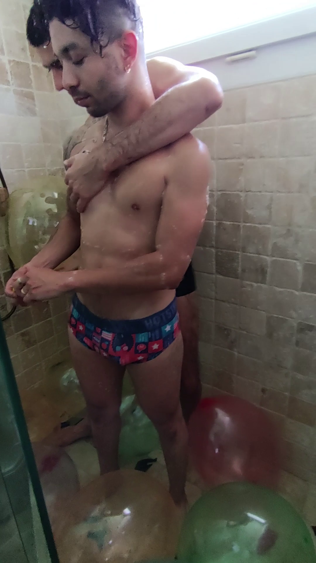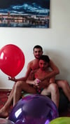 In the first part they are sitting on a swim ring and pin pop 17" tuftex balloons, after that they puncture with the pins the inflatable swim ring.
