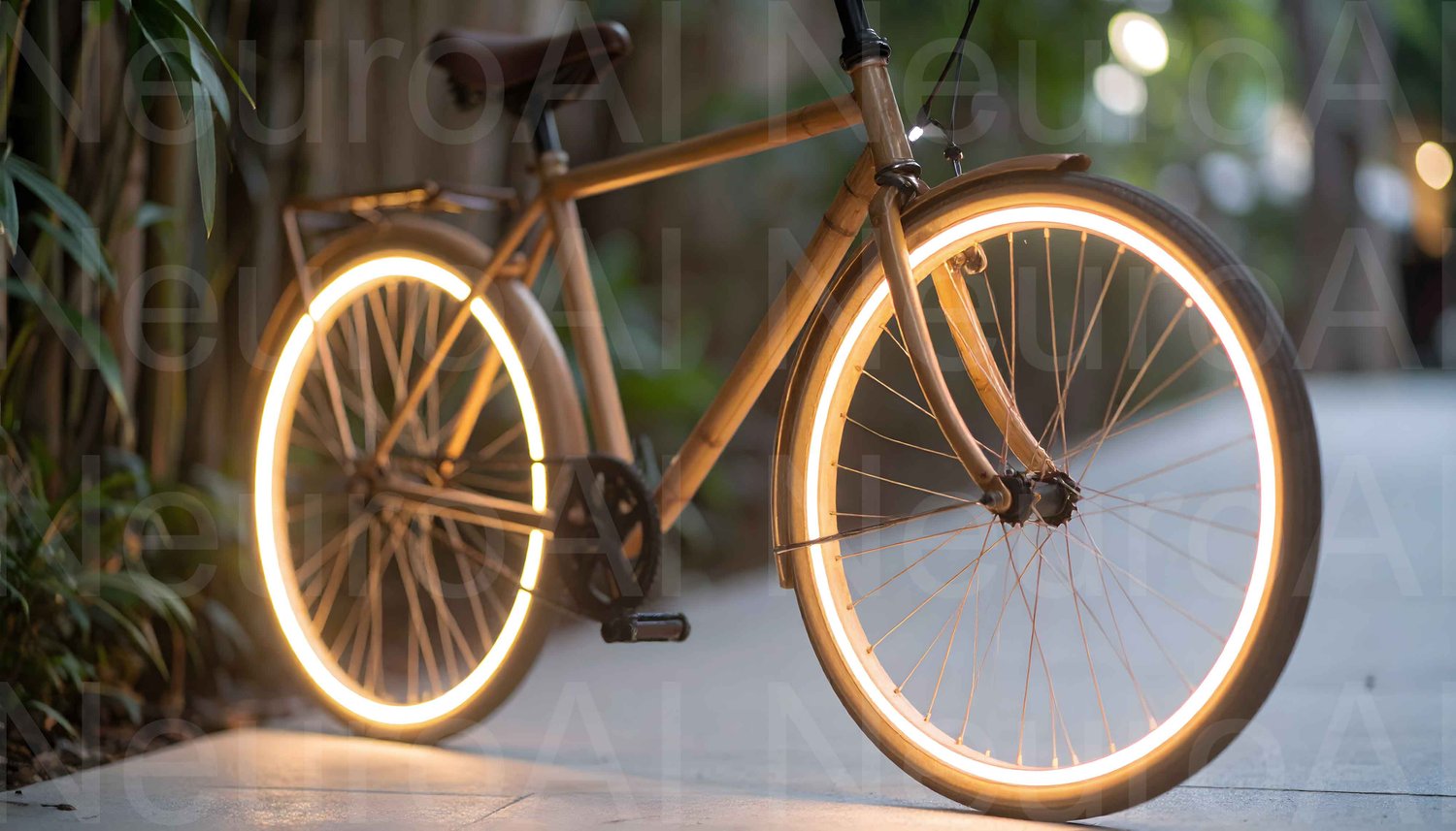 Eco-friendly bamboo bicycle with illuminated wheels glowing at dusk, perfect for modern sustainable transport concepts.