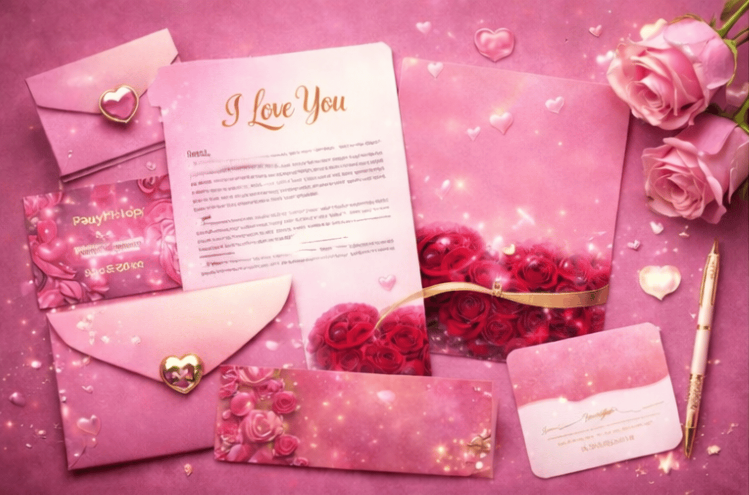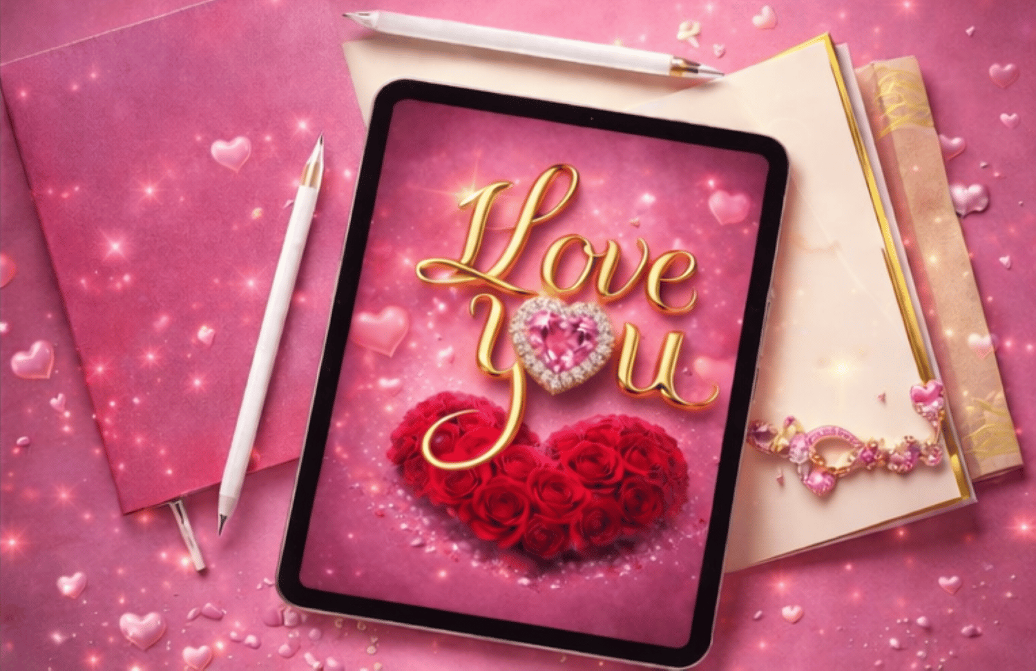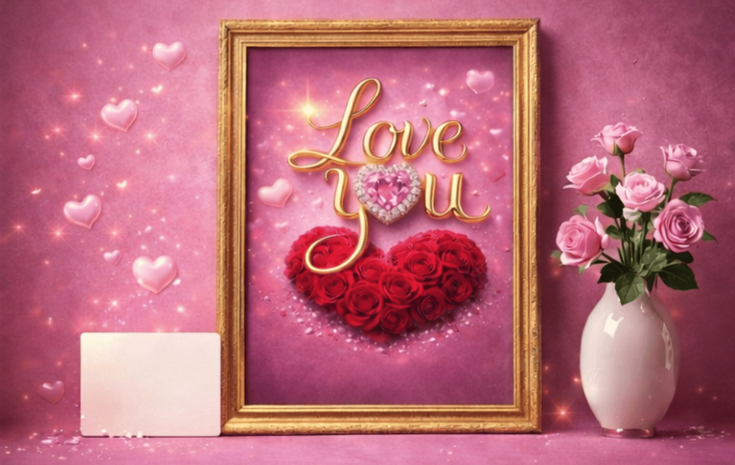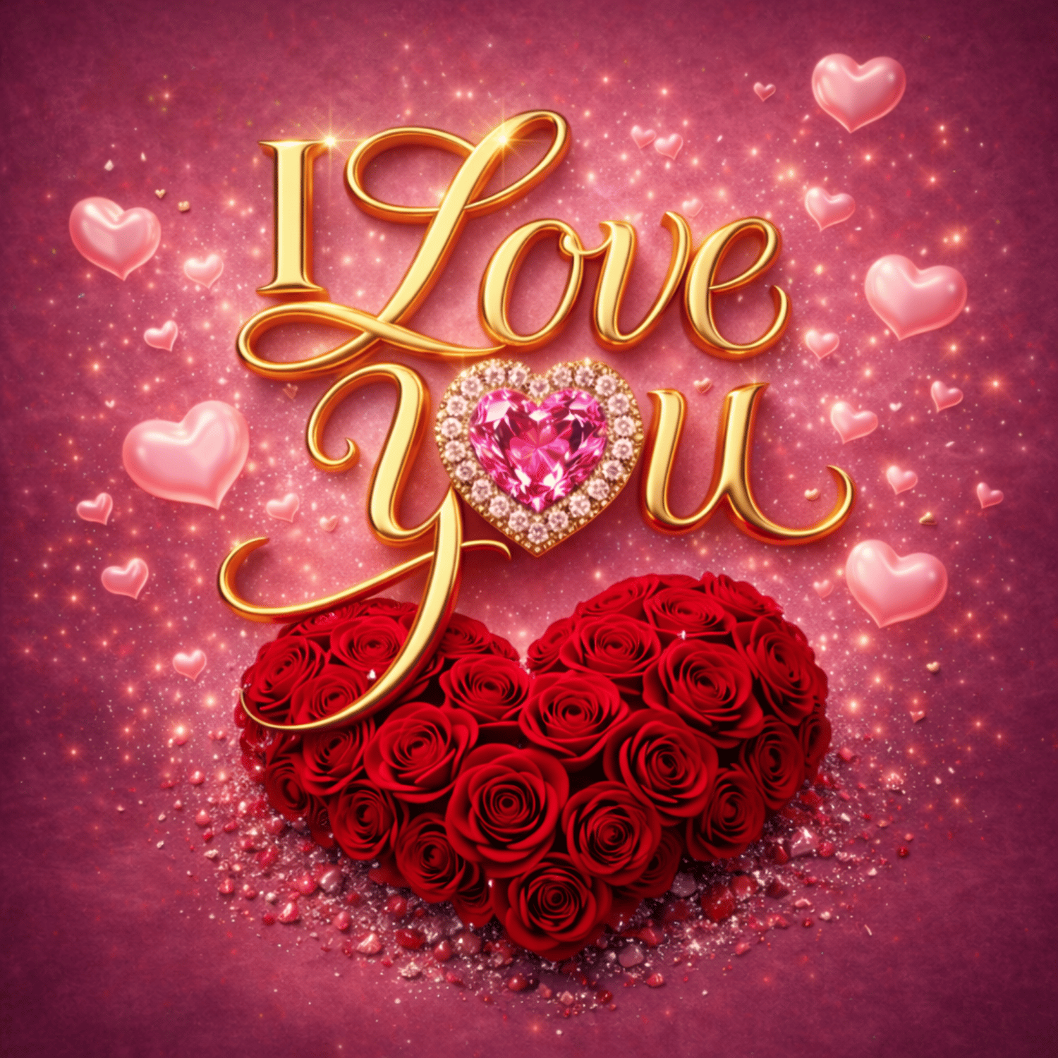 This ultra-realistic luxury romantic artwork features sculpted gold calligraphy spelling “I Love You”, centered around a diamond-cut pink heart gemstone and a meticulously arranged heart of deep red roses. Designed with a soft glowing background and floating hearts, this artwork radiates romance, warmth, and exclusivity.