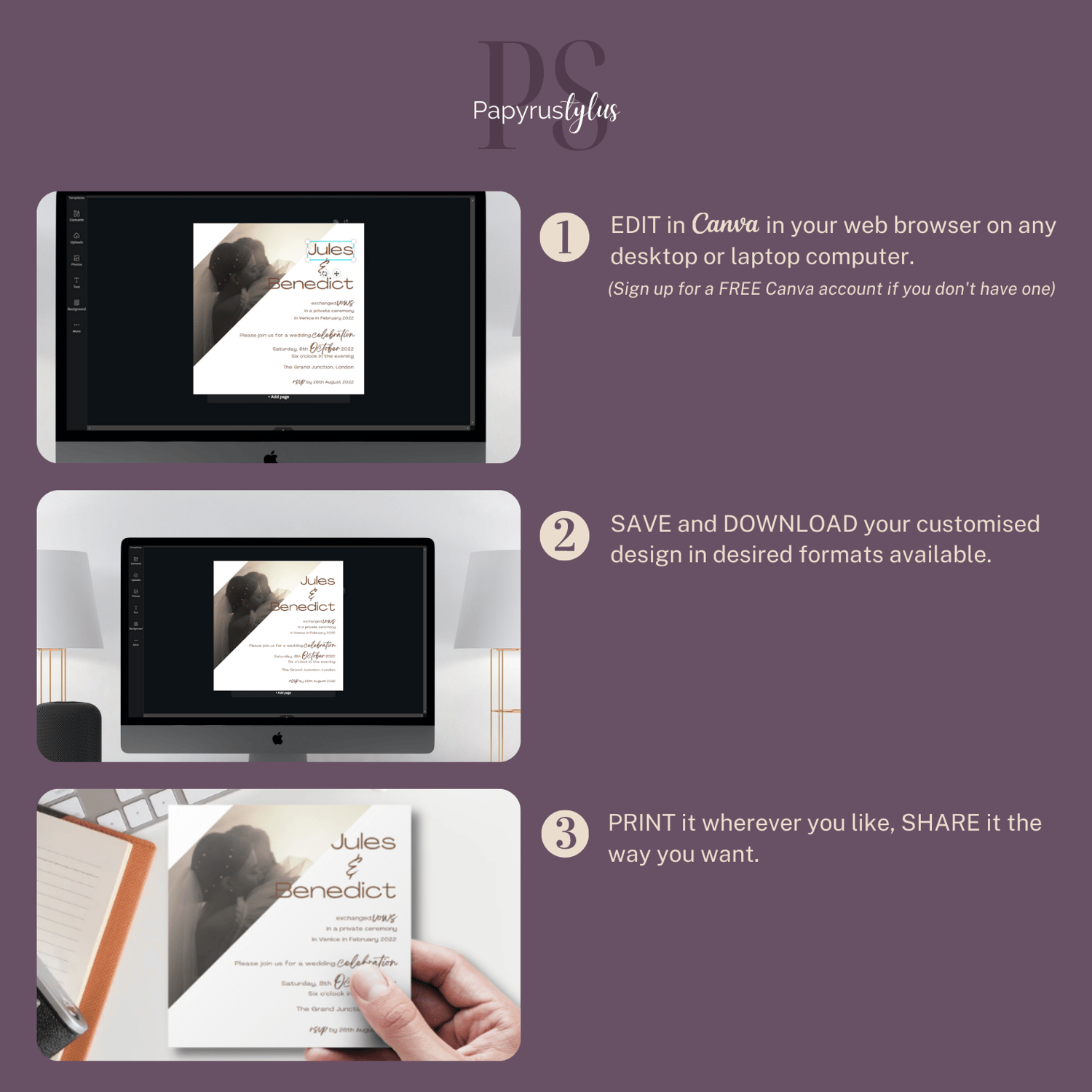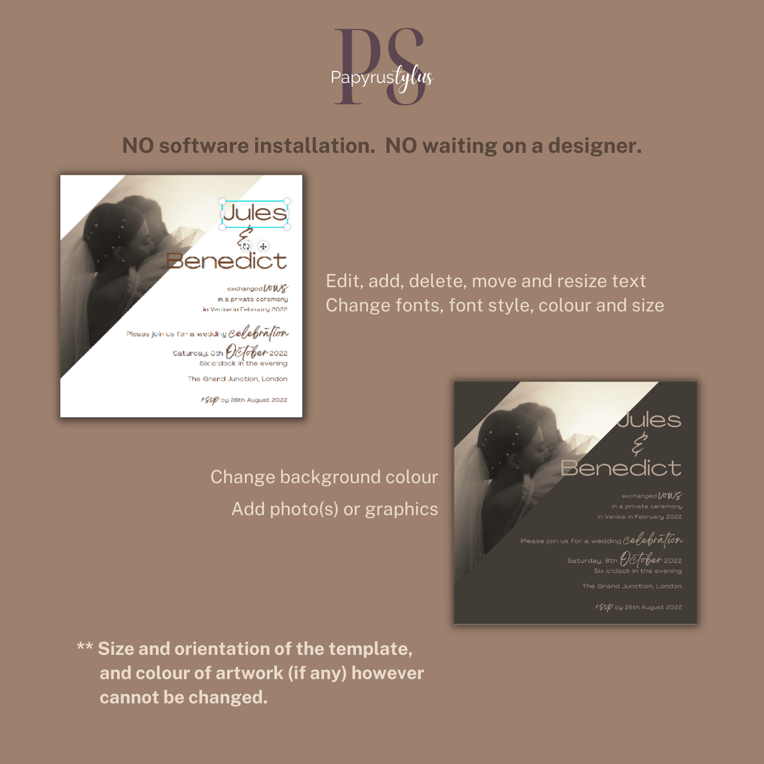 This wedding invitation template features a photo stripe where you can place an image that captures a precious moment of YOU both and an ingenious typography of stylish fonts.