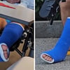 You can see his left foot in a SLC cast splint fixed with a blue bandage in all details and from nearly all angles. Look at his toes, they are neat, georgeous, delicious...simply great! All the time the guy is sitting in his wheelchair and is obsessed with his smartphone.
