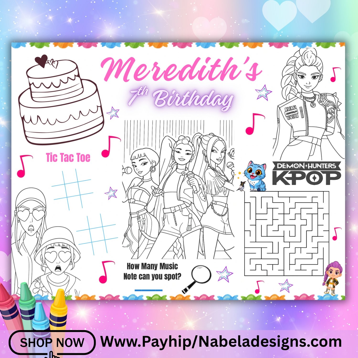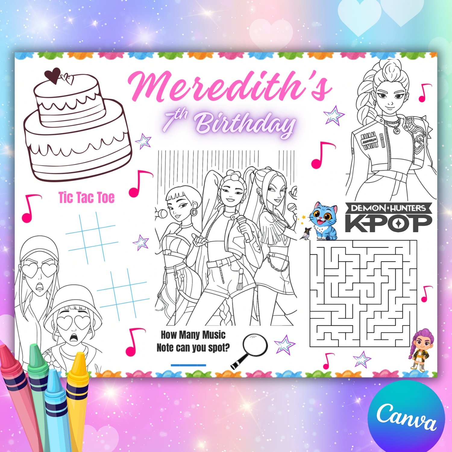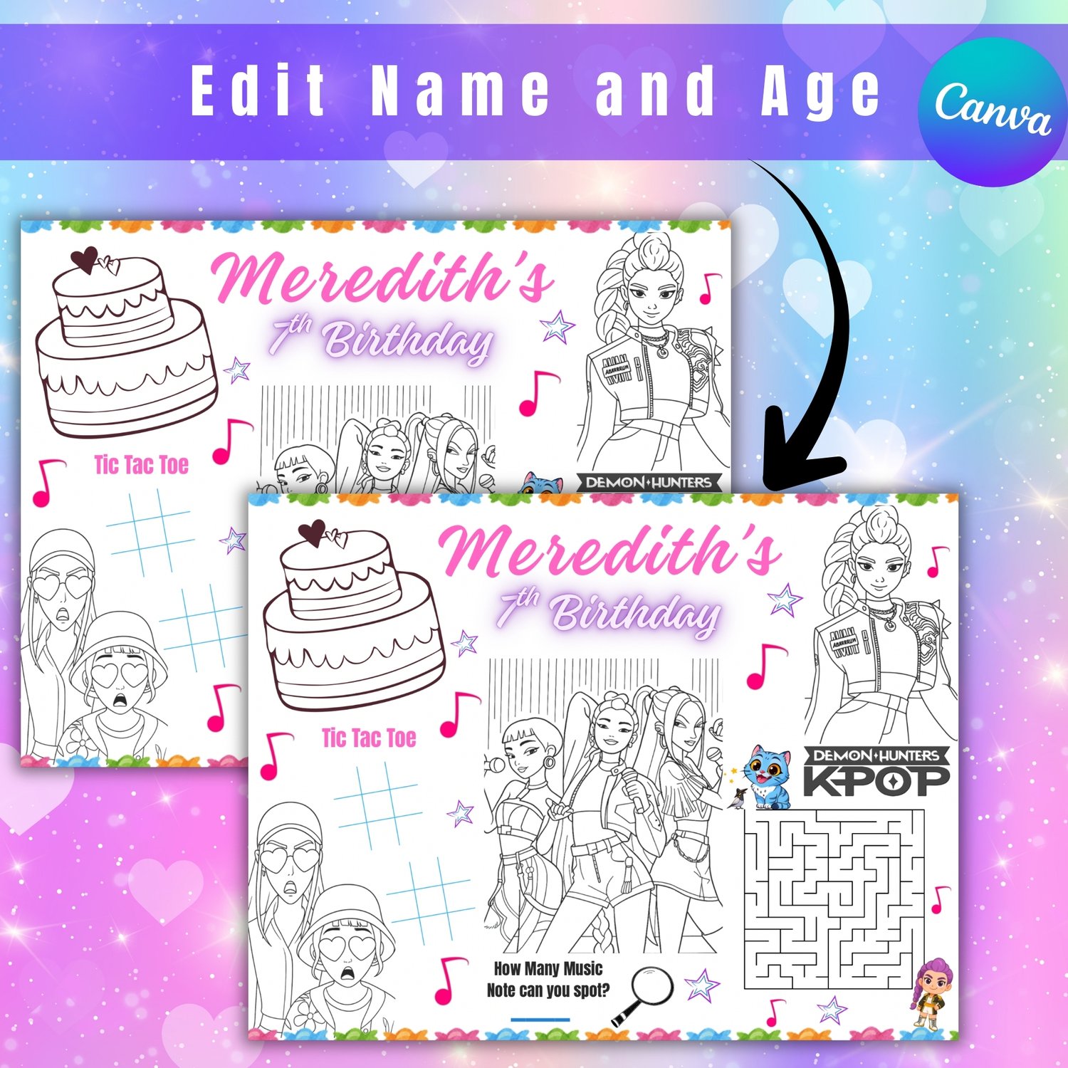Bring music, magic, and adventure together with this Editable K-Pop Demon Hunters Coloring Page! 🎤⚔️ Designed for kids who love K-pop and anime, this fun Canva template (size 11x8.5 inches)lets you personalize the name and age — perfect for birthdays, party favors, or creative gifts.