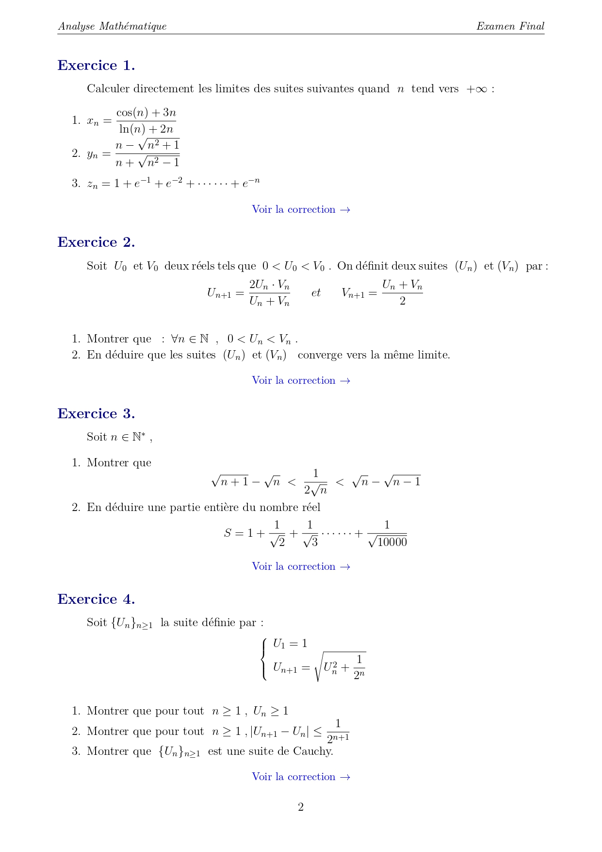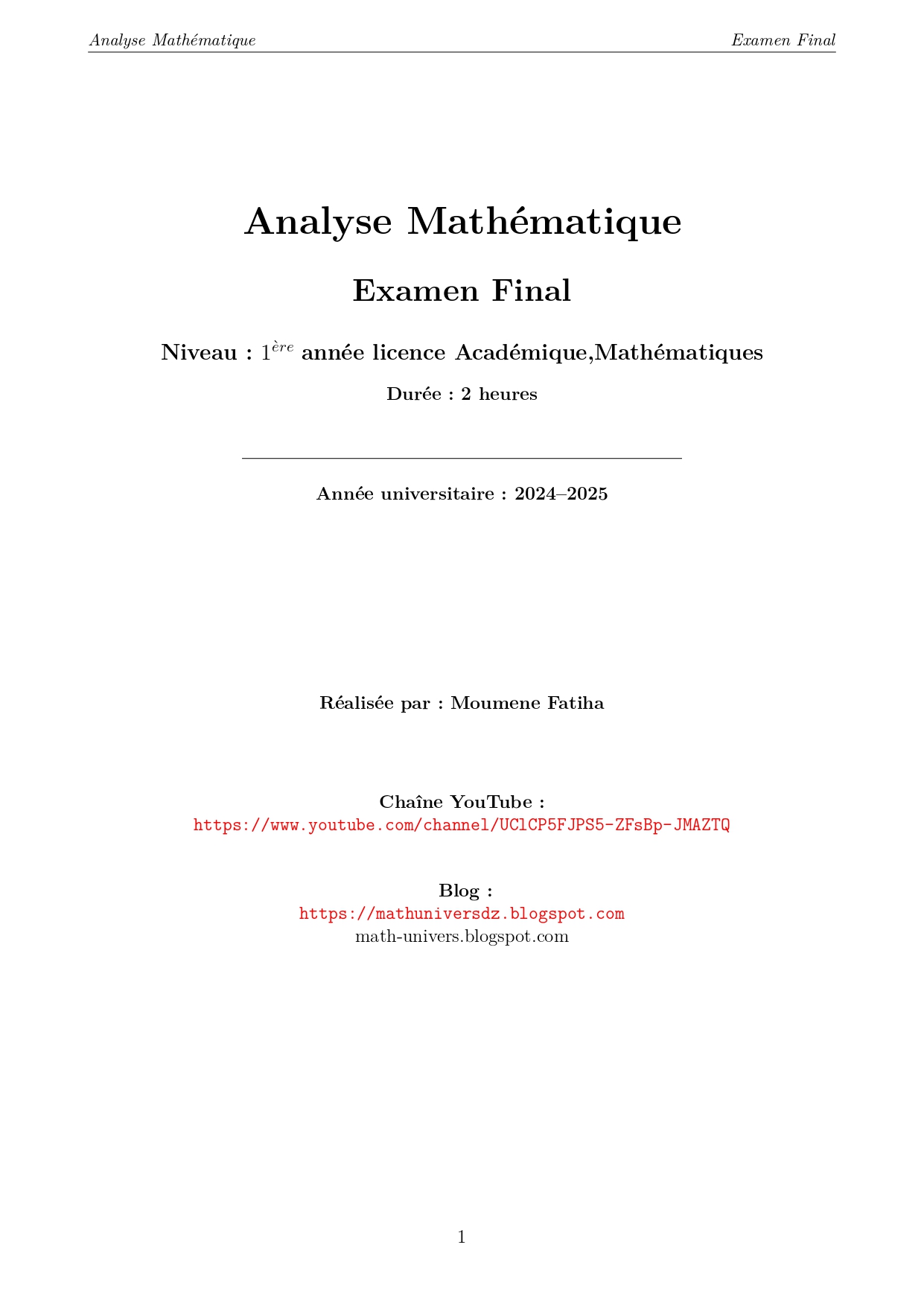 📘 Examen Final – Analyse Mathématique (Licence 1) Â