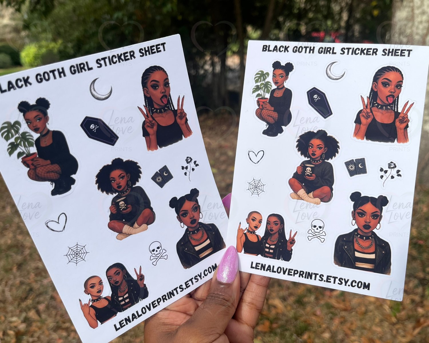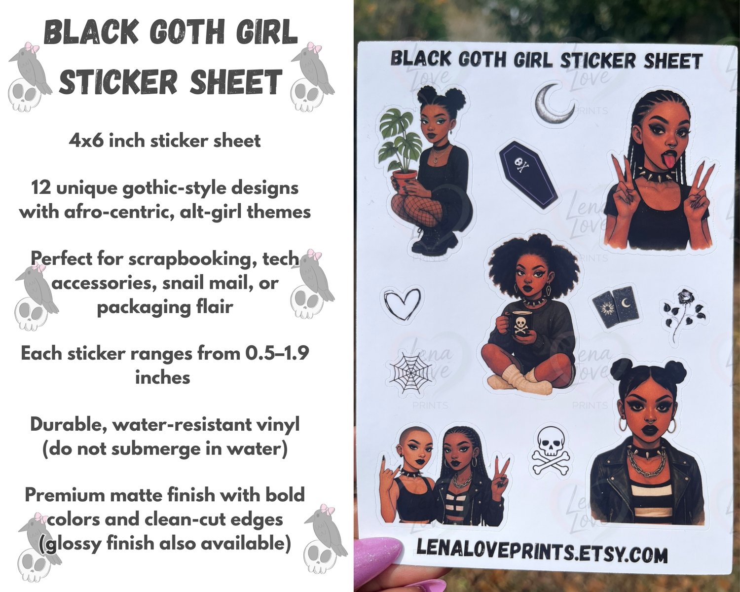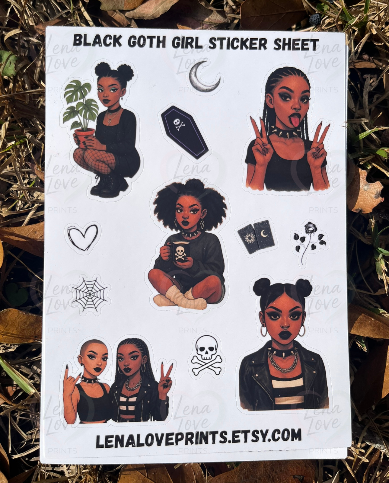This 12-piece Black Goth Girl sticker sheet celebrates alternative beauty, Black girl magic, and bold goth aesthetics! Featuring fierce, stylish illustrations of Black girls in goth fashion with natural hair, piercings, and edgy vibes, these stickers are perfect for personalizing journals, laptops, water bottles, and more.