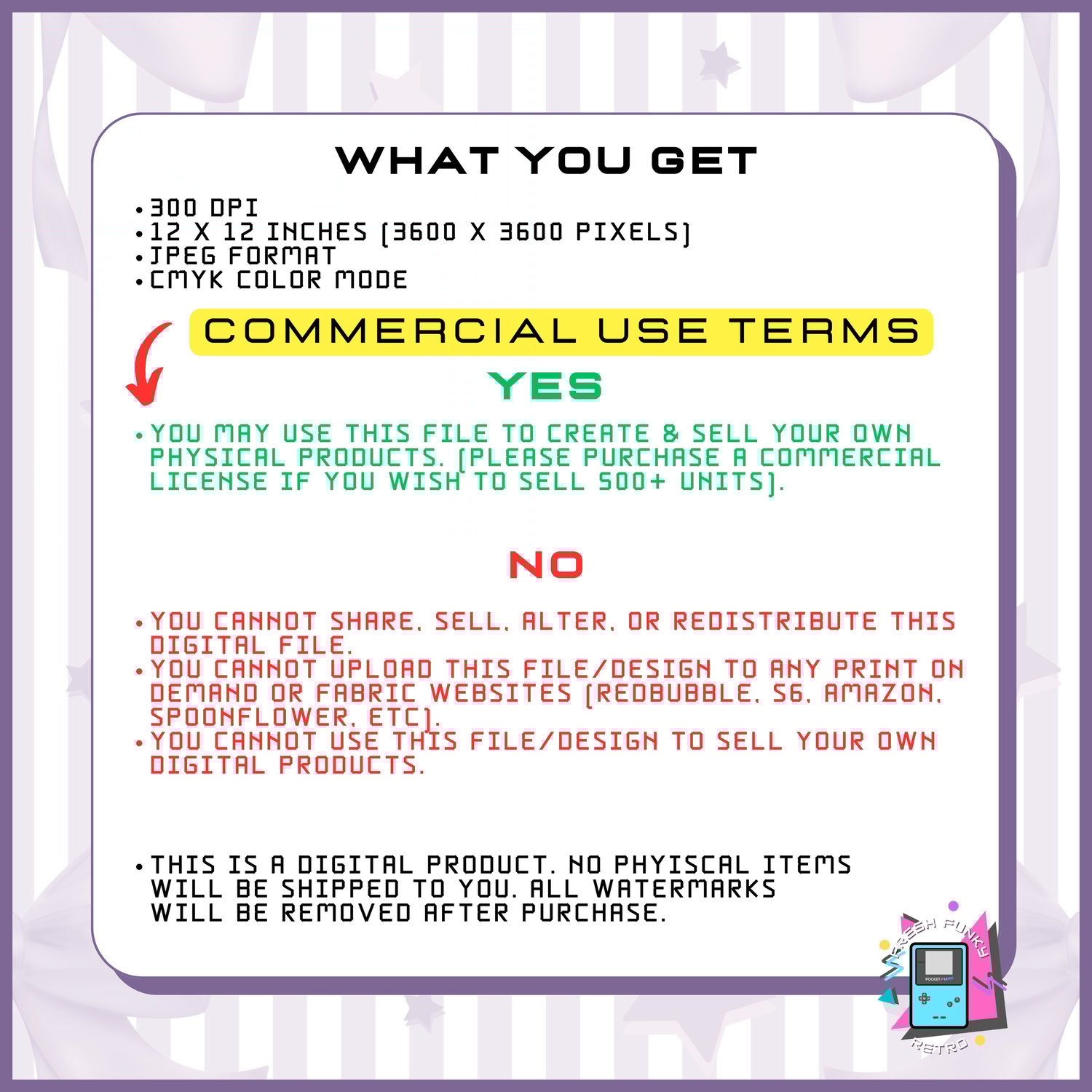 - You cannot upload this file/design to any print on demand or fabric websites (Redbubble, S6, Amazon, Spoonflower, etc).