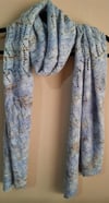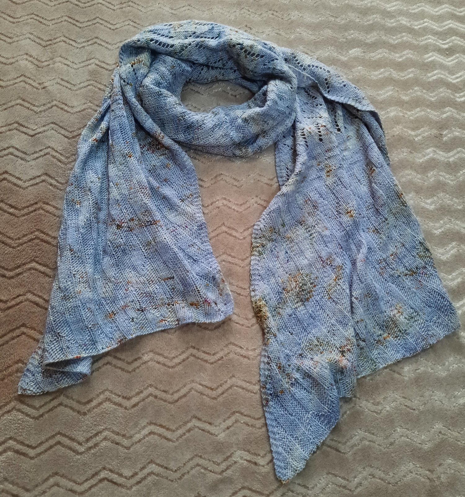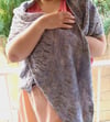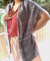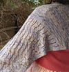 This is a lightweight floaty elegant but easy to wear wrap, full of lace and texture, ideal as a warm weather cover up or wrapped around for delicate warmth. It is knit in a leaning bias shape with regular increasing and decreasing as it forms, and whilst the textured and lace patterns keep it an engaging knit, they are quite simple and intuitive.