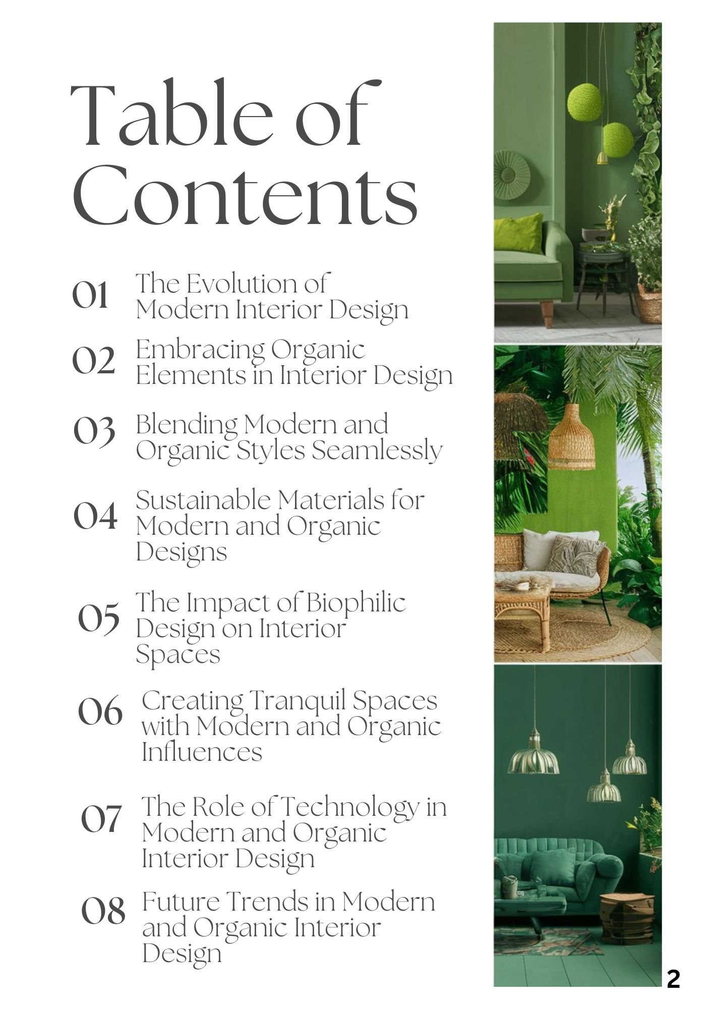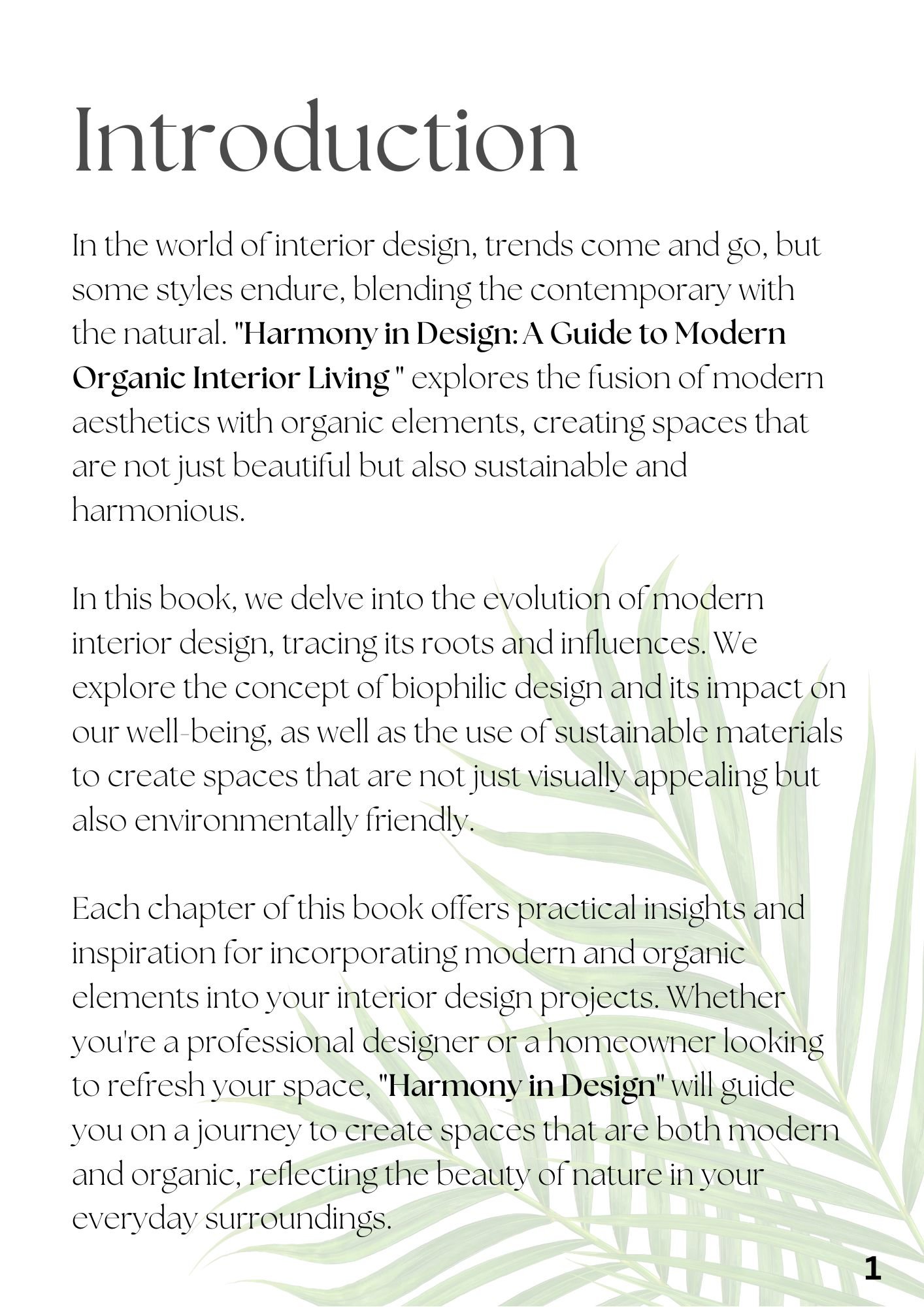 "Harmony in Design: A Guide to Modern & Organic Interior Living" is a comprehensive E-book exploring modern aesthetics' fusion with organic elements in interior design. From the evolution of modern interior design to the impact of biophilic design on interior spaces, this book offers practical insights, tips, and inspiration for creating beautiful, sustainable, and harmonious interior spaces.