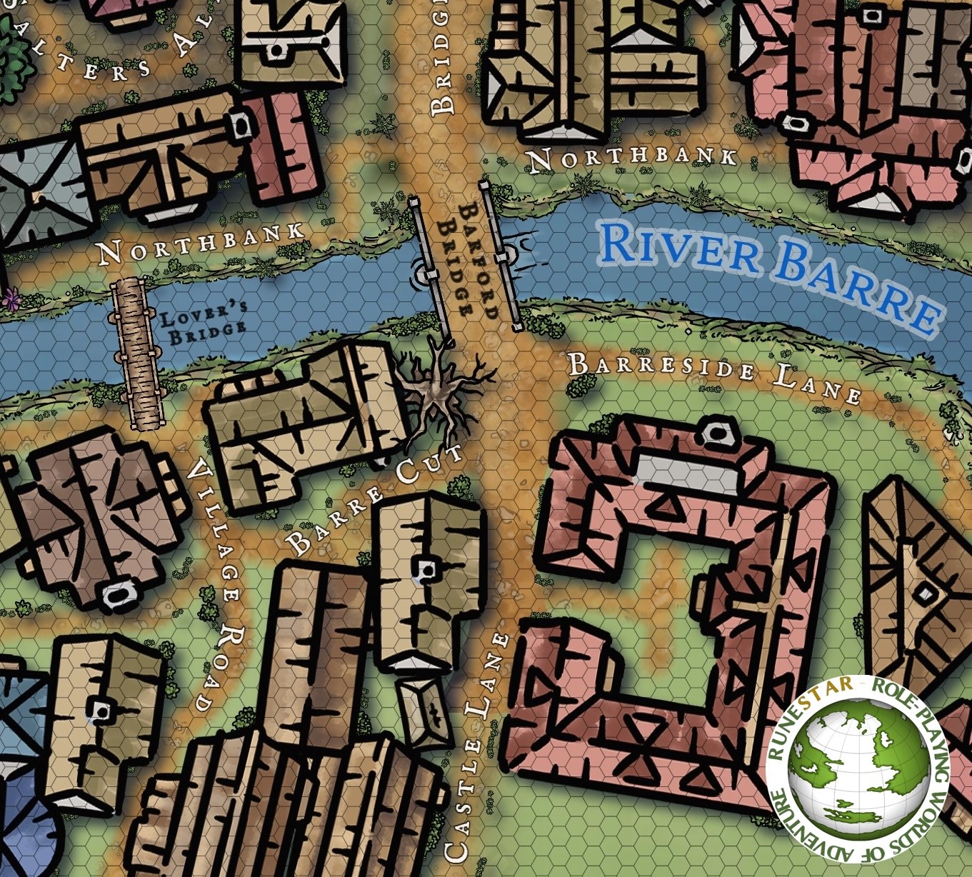 A Town map of Market Greenbury-on-Barre in the Navalle region of Varlam (see Varlam Regional Map) in the World of Rune. The map comes in 6 different forms, all in 8k high resolution, together with a PDF information sheet giving a brief history of the town.