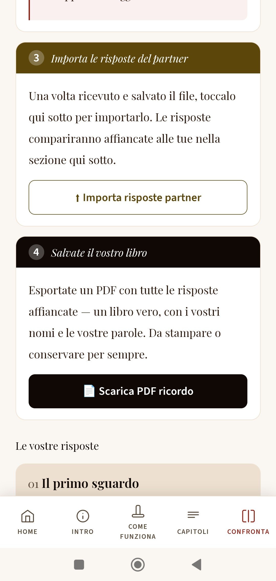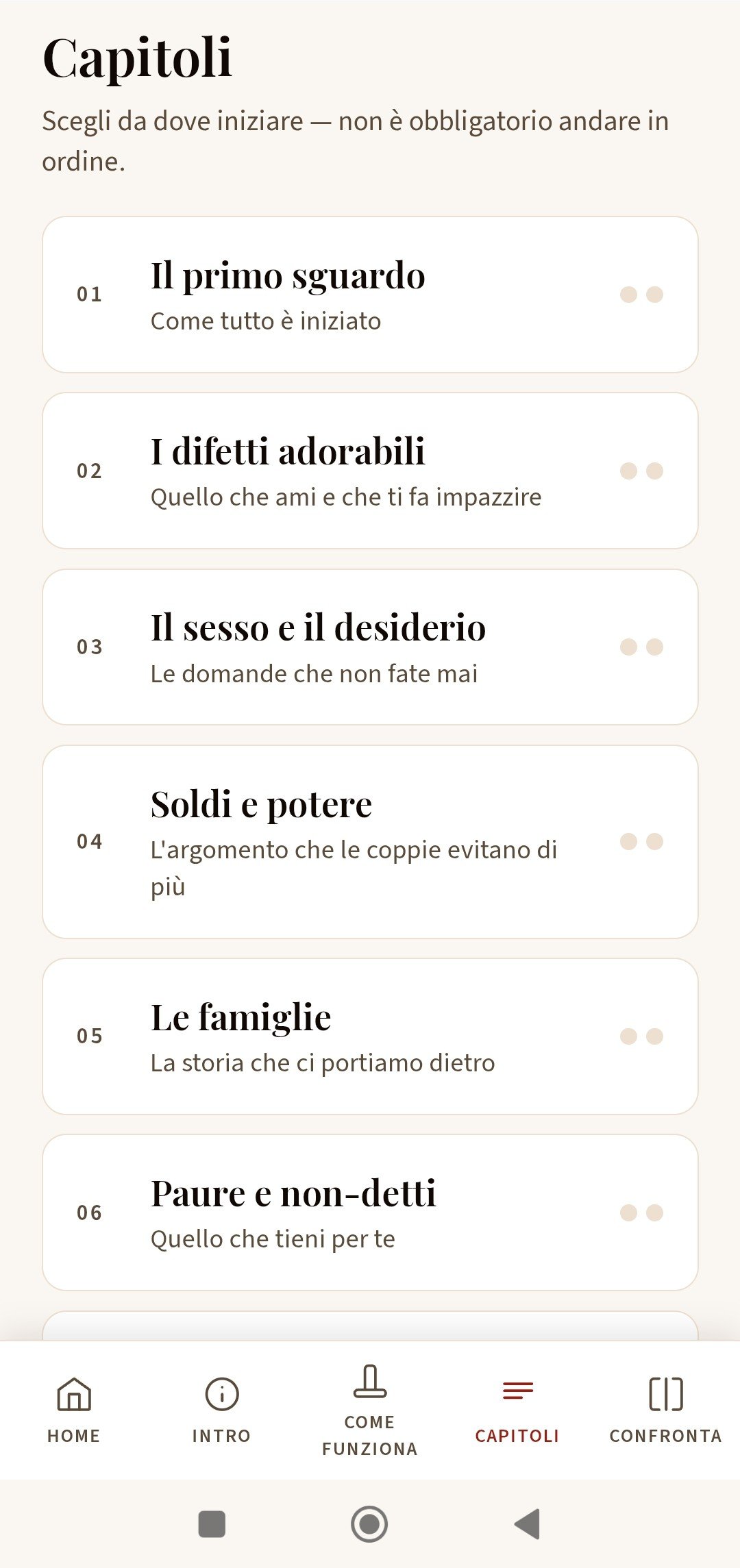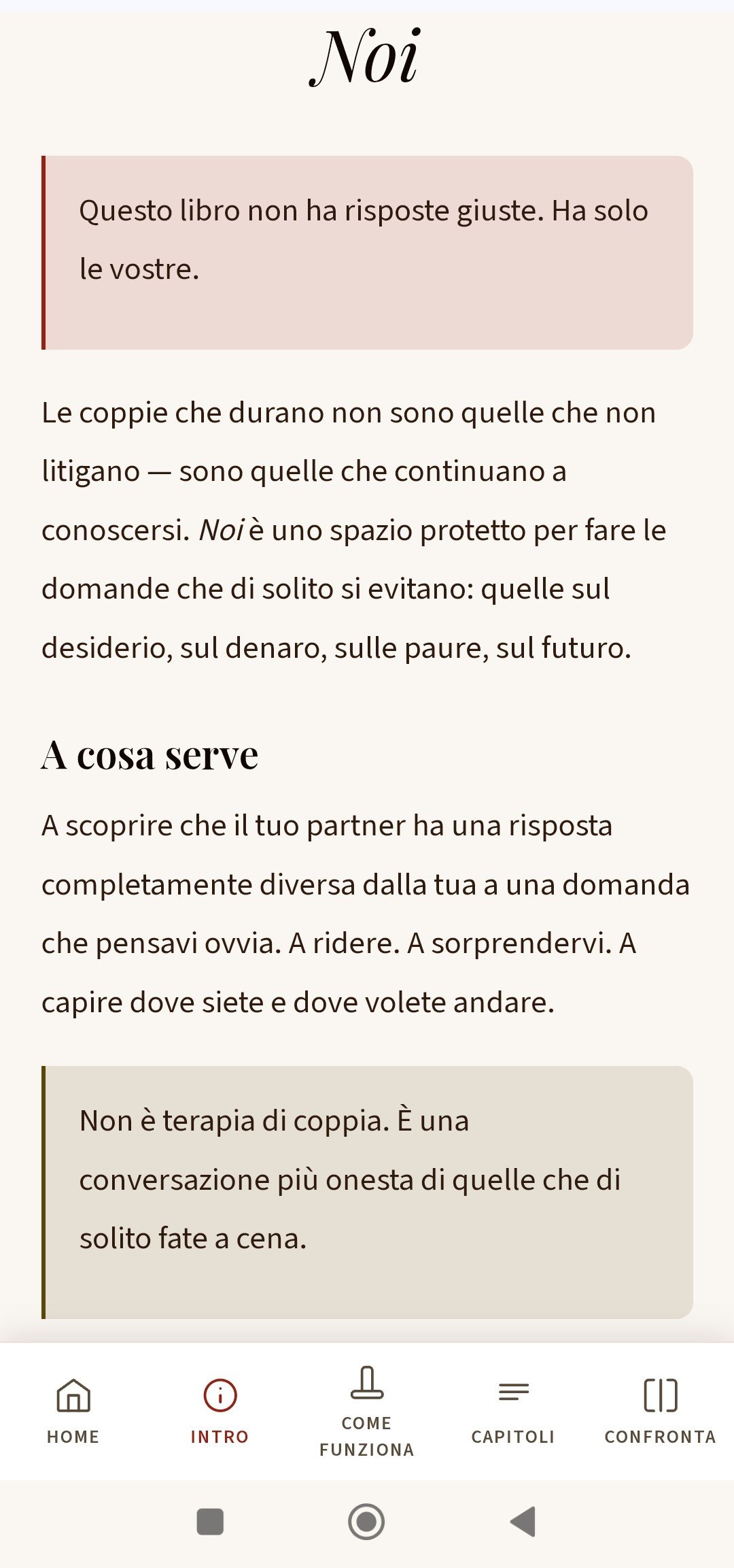 Un libro digitale interattivo per coppie. 8 capitoli, 24 domande scomode. Scrivi, confronta, scopritevi.