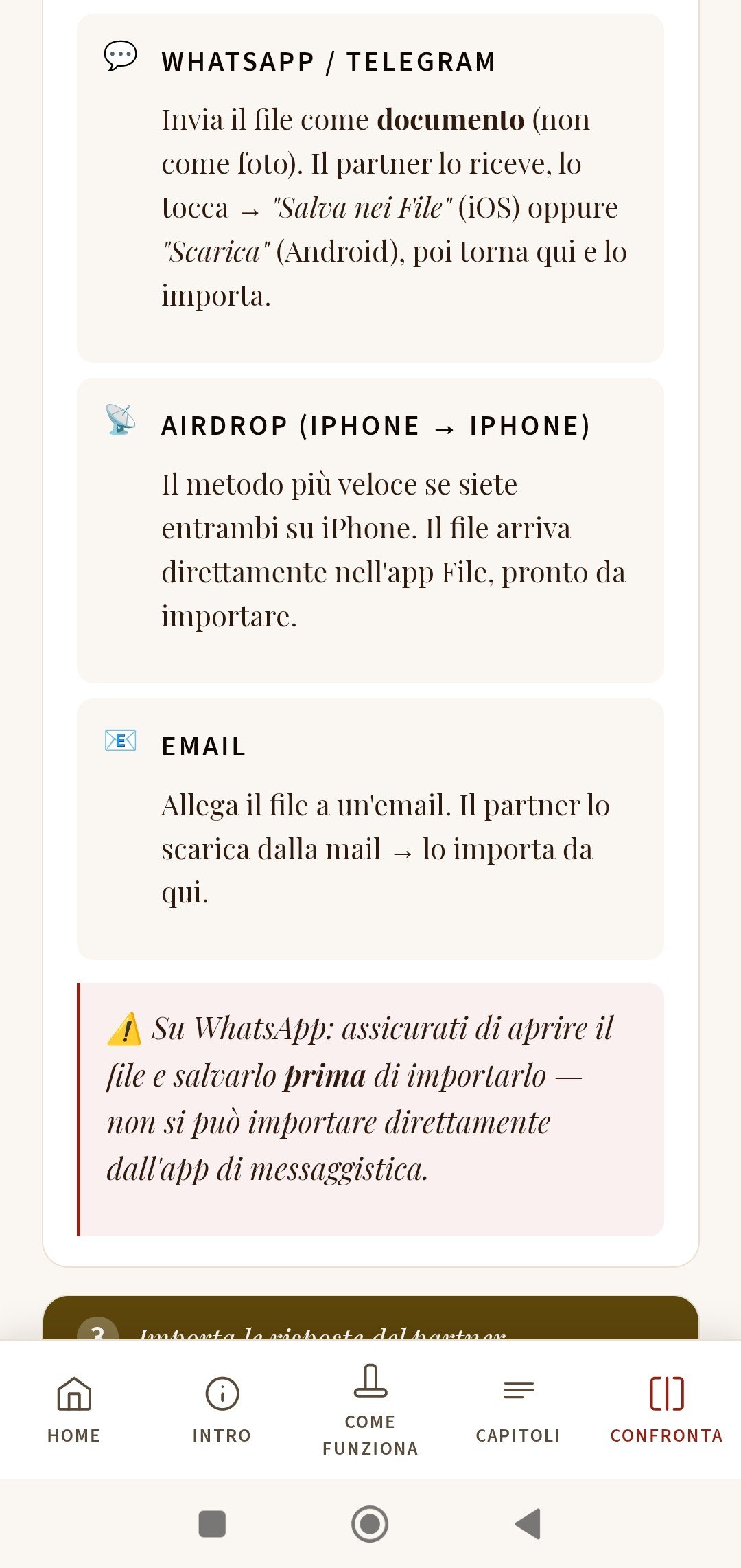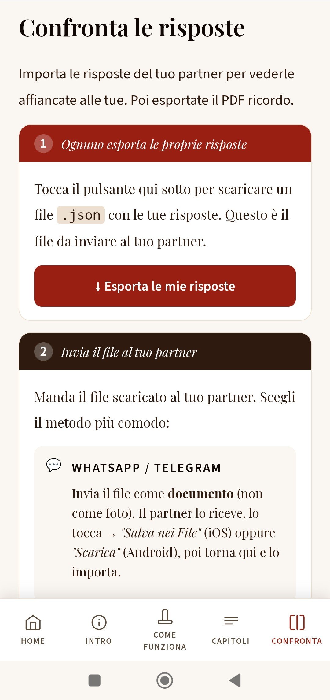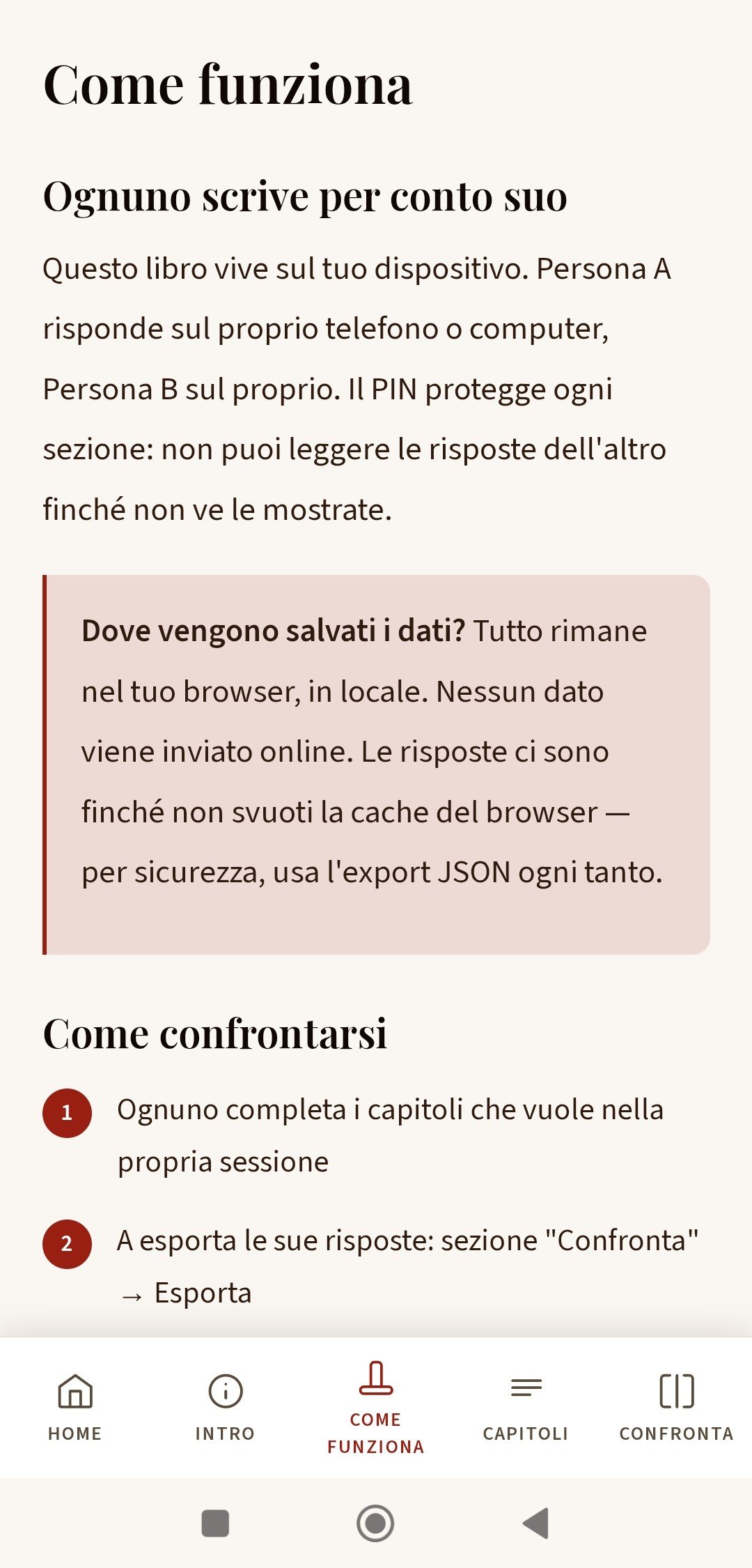 Un libro digitale interattivo per coppie. 8 capitoli, 24 domande scomode. Scrivi, confronta, scopritevi.