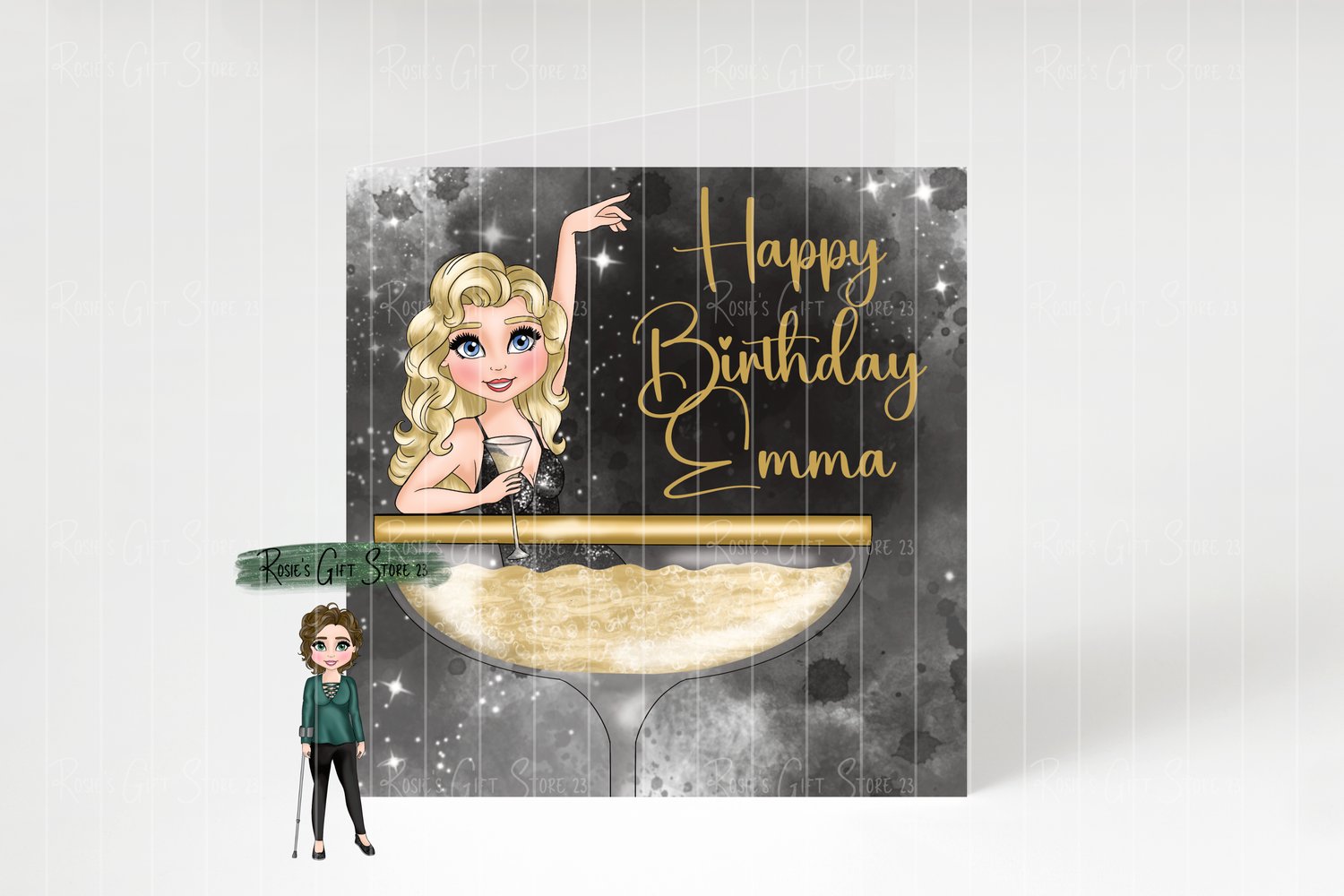Personalised black and gold martini girl birthday card
