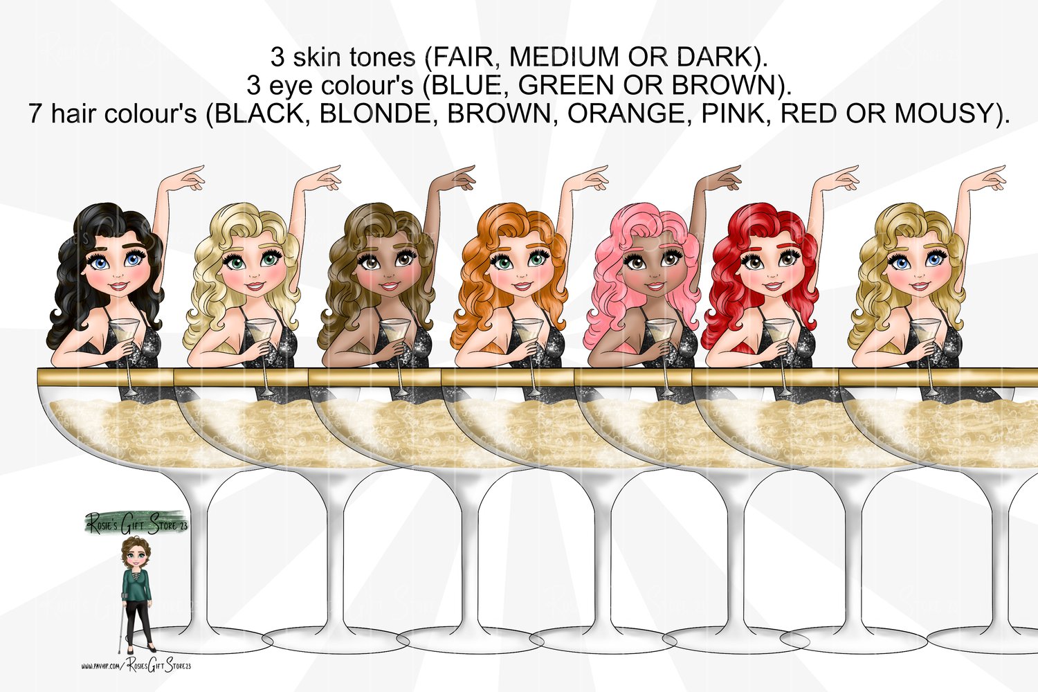 3 Skin Tones, 3 eye colours & 7 Hair colours available.