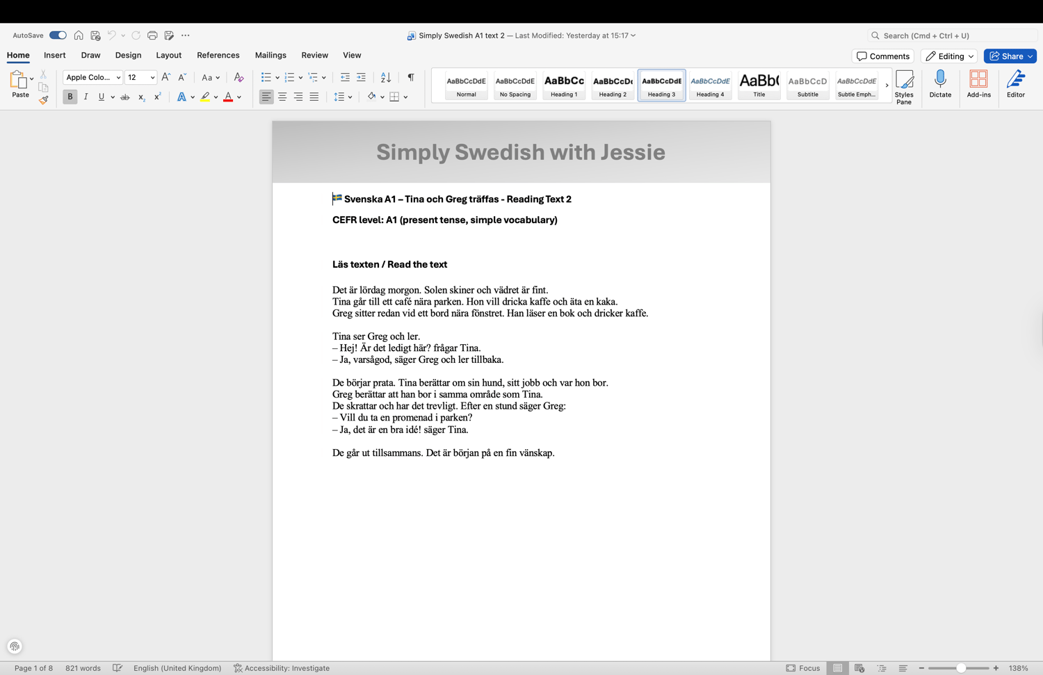 This beginner-friendly Swedish worksheet is designed for A1 learners and focuses on present tense verbs, everyday vocabulary, and reading comprehension through a short, engaging story.