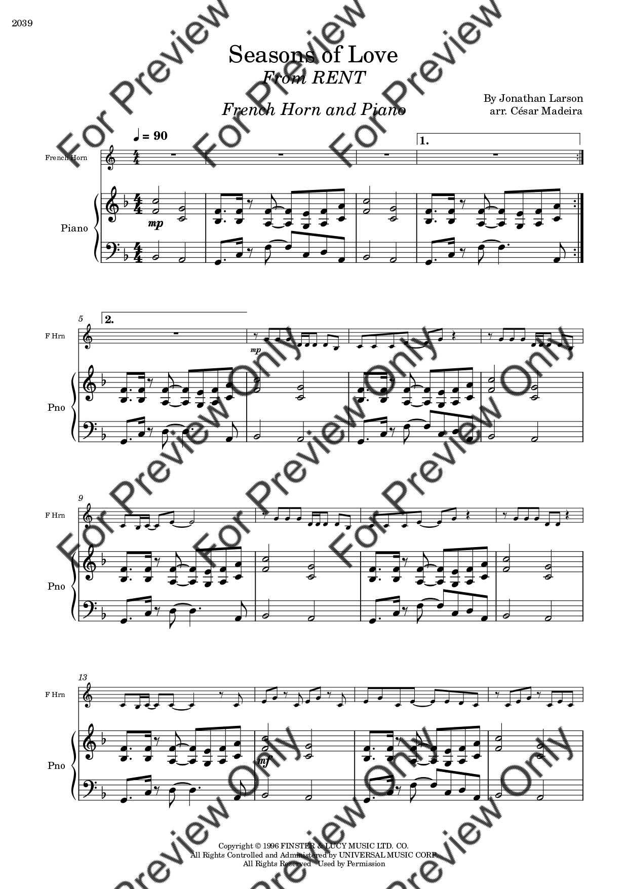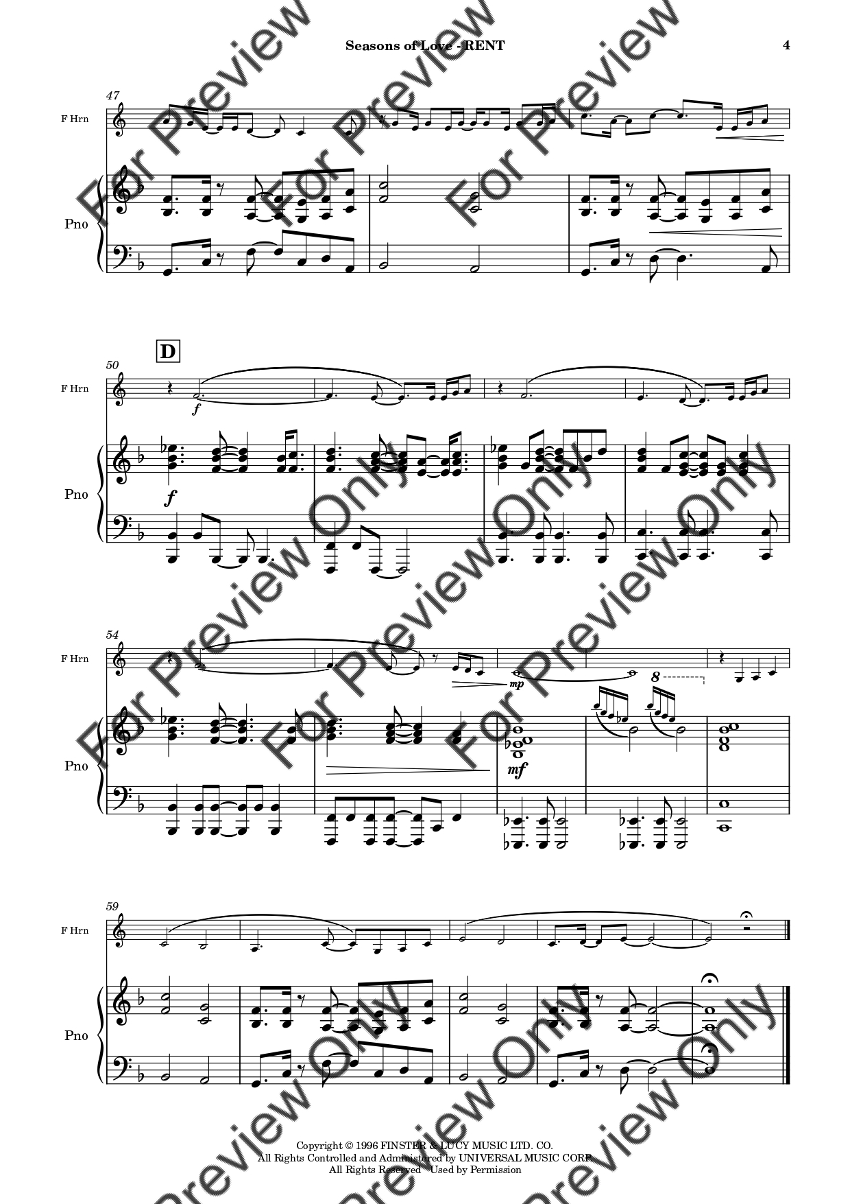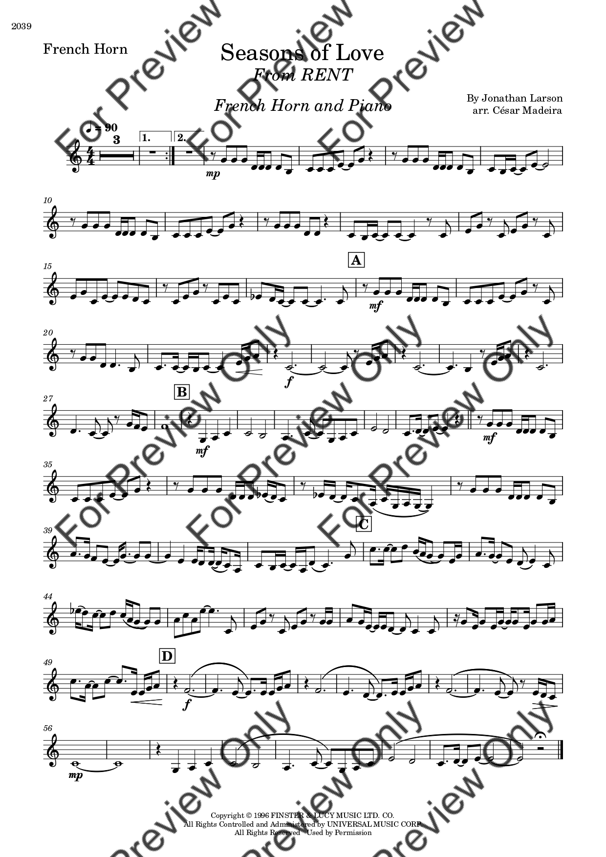 Seasons Of Love from RENT by Jonathan Larson. Arrangement for French Horn and Piano. With Full Score and Individual Parts. Have fun!