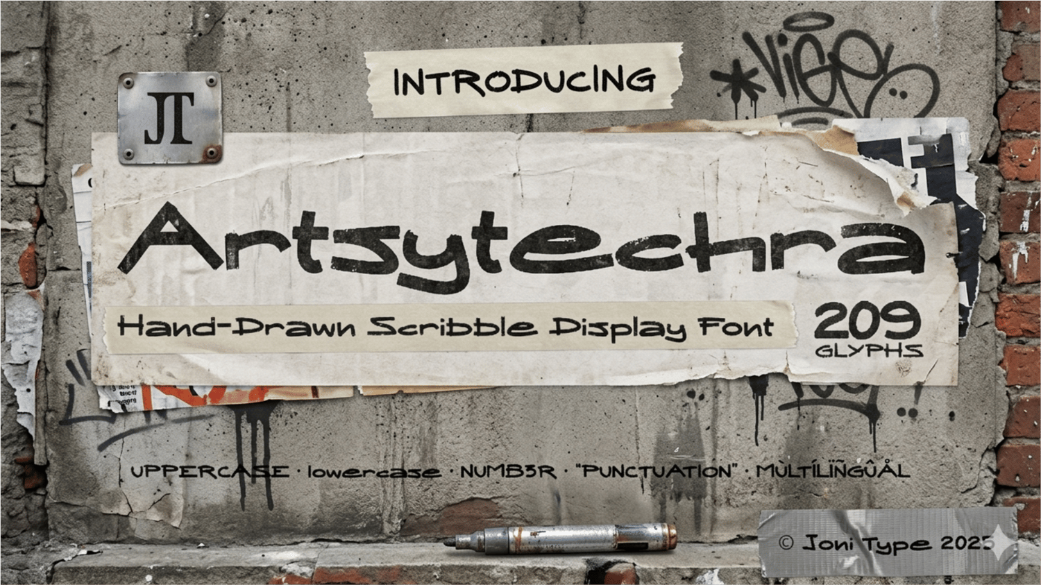 Artsytechra is a bold hand-drawn scribble display font inspired by raw street art, urban textures, and rebellious creative energy. Designed to feel imperfect, expressive, and alive, this font captures the authentic look of marker strokes, graffiti tags, and spontaneous hand lettering.