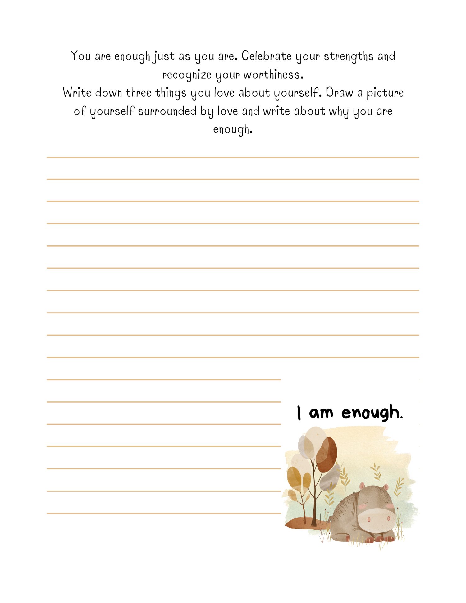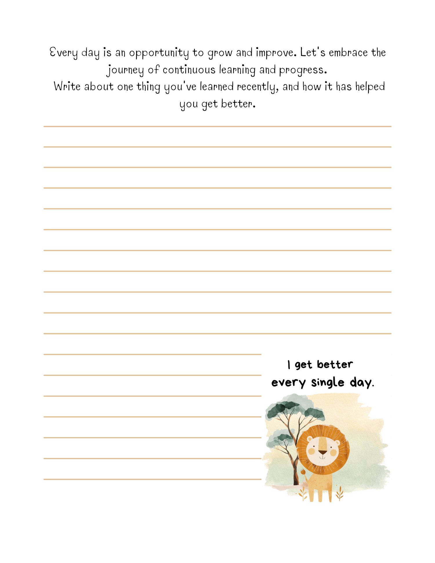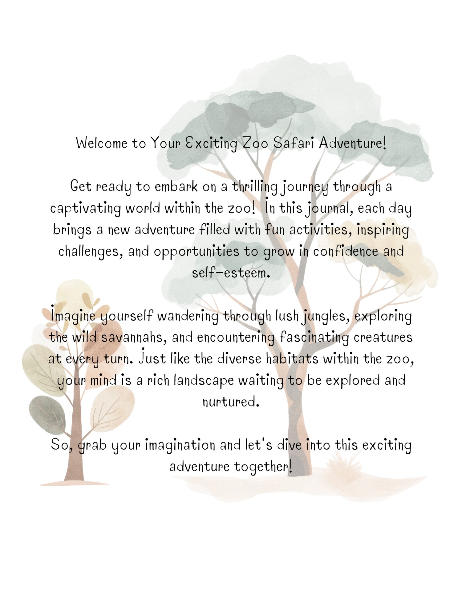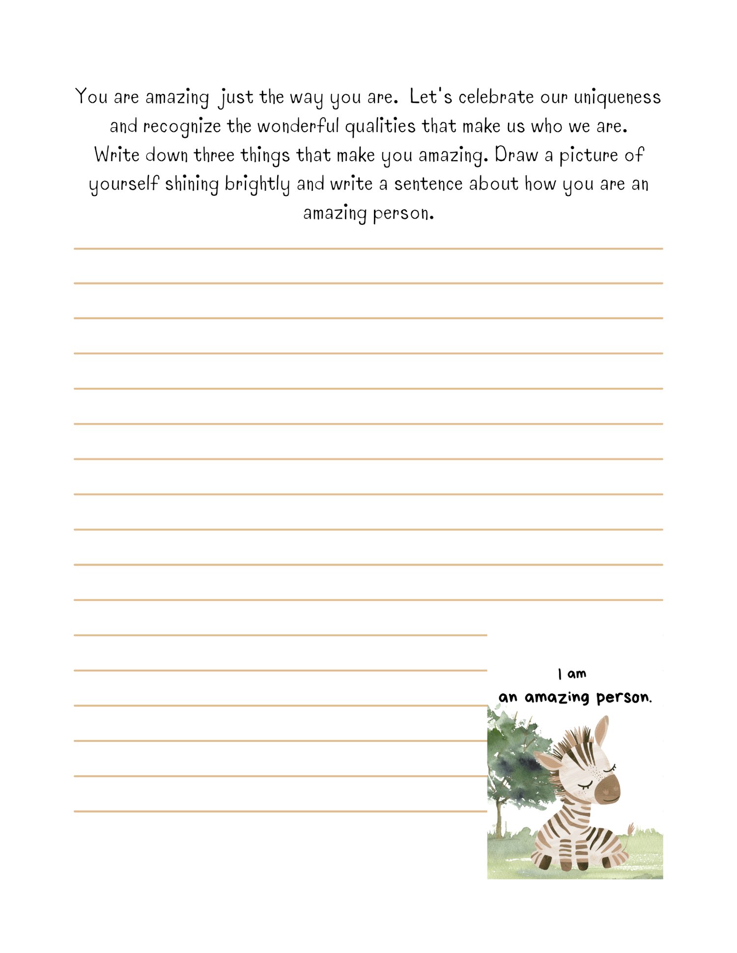 🌈 Elevate young hearts and minds with our specially designed 31 pages of printable prompted writing and drawing activities with cute safari zoon images and uplifting affirmations, perfect for kids aged 8-12. -- centered on "Self-Esteem & Confidence," to nurture positive self-perception and confidence-building.