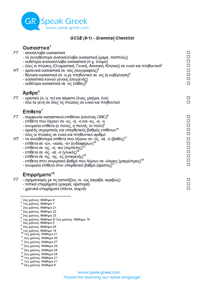 Download for free the Grammar checklist for both Foundation and Higher Tier of the GCSE (9-1) in Modern Greek exam, Specification 2017. The footnotes refer to the lessons of the complete educational material GCSE Greek Higher Tier Preparing for Success Year 1 and GCSE Greek Higher Tier Preparing for Success Year 2.