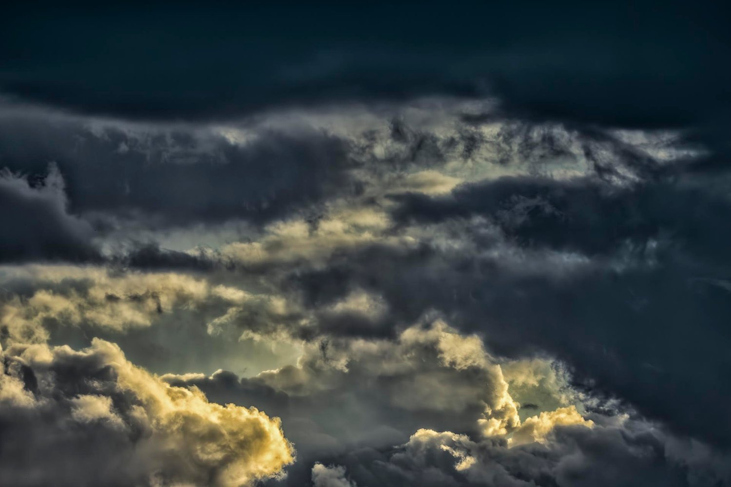 Dark and dramatic clouds fill the sky, with sunlight breaking through, casting an ethereal glow. The contrast between the light and dark areas creates a striking atmosphere.
