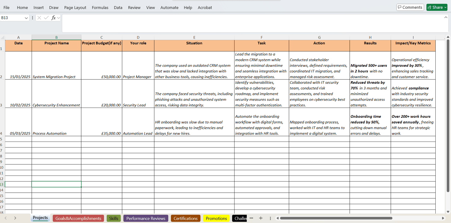 ✔️ Multiple structured sheets covering Projects, Accomplishments, Skills, Performance Reviews, Certifications, Promotions, and Challenges