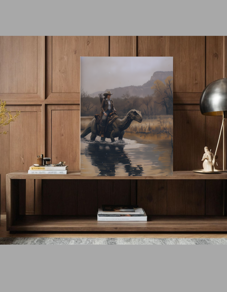 Elevate your space with this captivating digital art download featuring a cowgirl atop a fierce dinosaur, splashing through a misty western frontier landscape in classic oil painting style. Ideal for printable wall art, posters, or home decor enthusiasts seeking unique fantasy western vibes. High-resolution PNG file for instant digital download – perfect for dinosaur art lovers, cowboy artwork collectors, and sci-fi western fans.