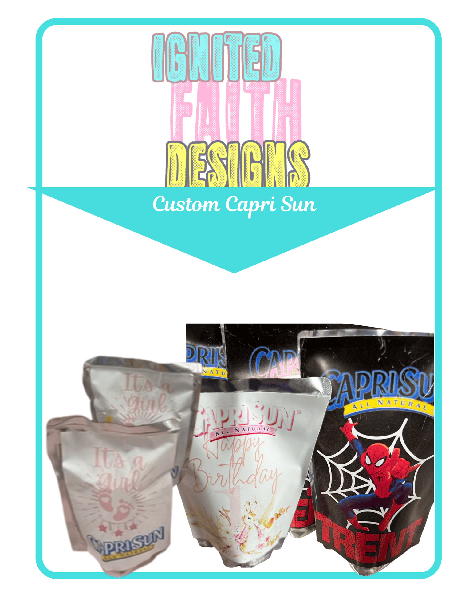 Custom juice pouch to match any theme or color scheme of your choosing. Common juice pouches are Capri Sun and Kool Aid Jammers. Flavors will depend on product availability! Comes by the dozen ( 12 pouches )