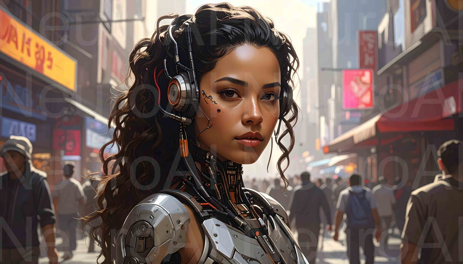 Futuristic cyborg woman walks vibrant city street