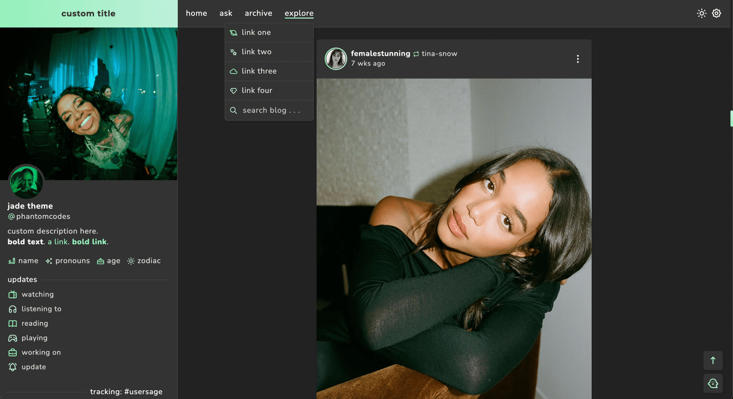 - headerbar includes custom title, home/ask/archive/explore links | day/night & tumblr controls buttons