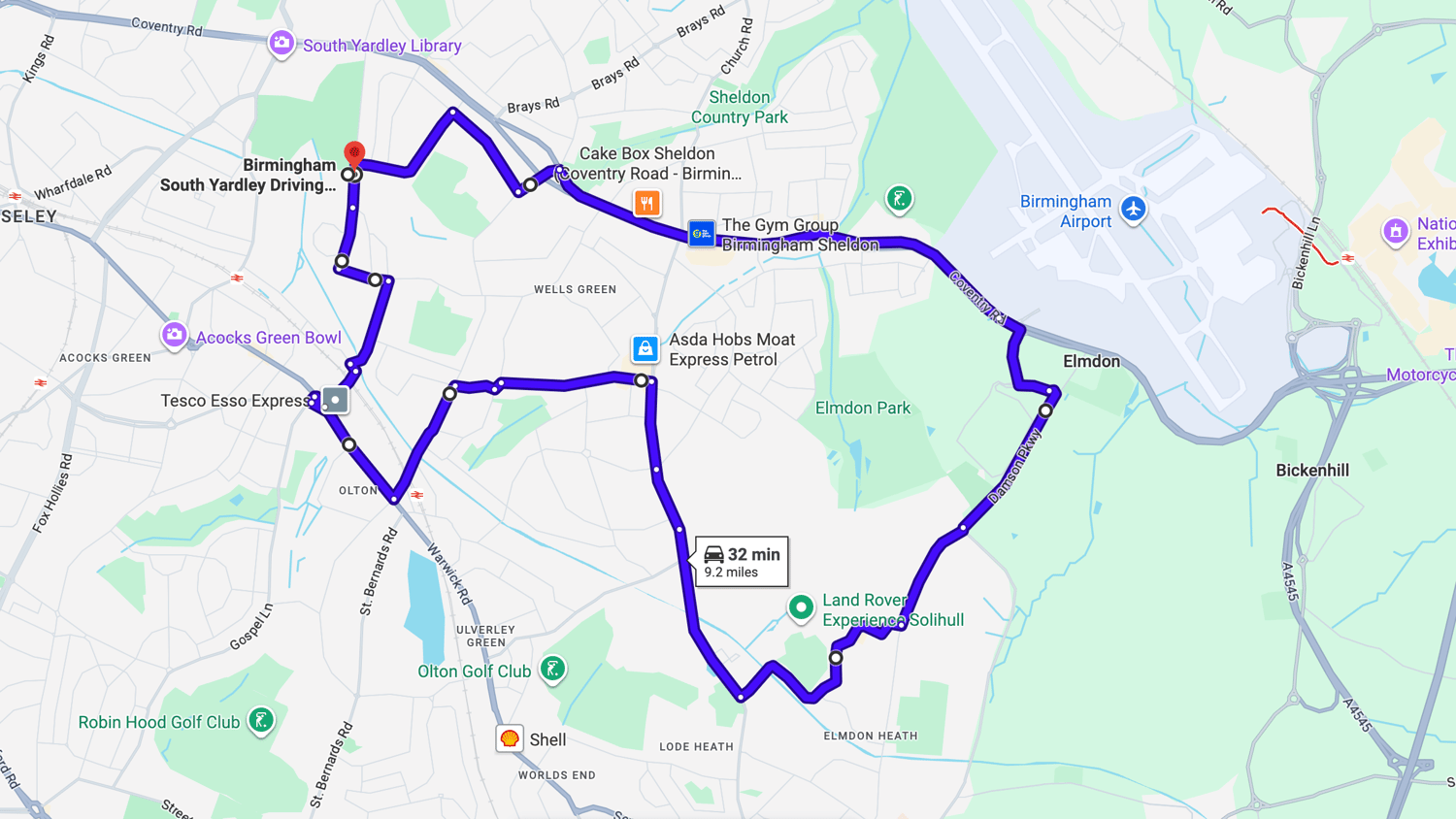 Practise real driving test routes in Birmingham (South Yardley) before your exam – open directly in Google Maps