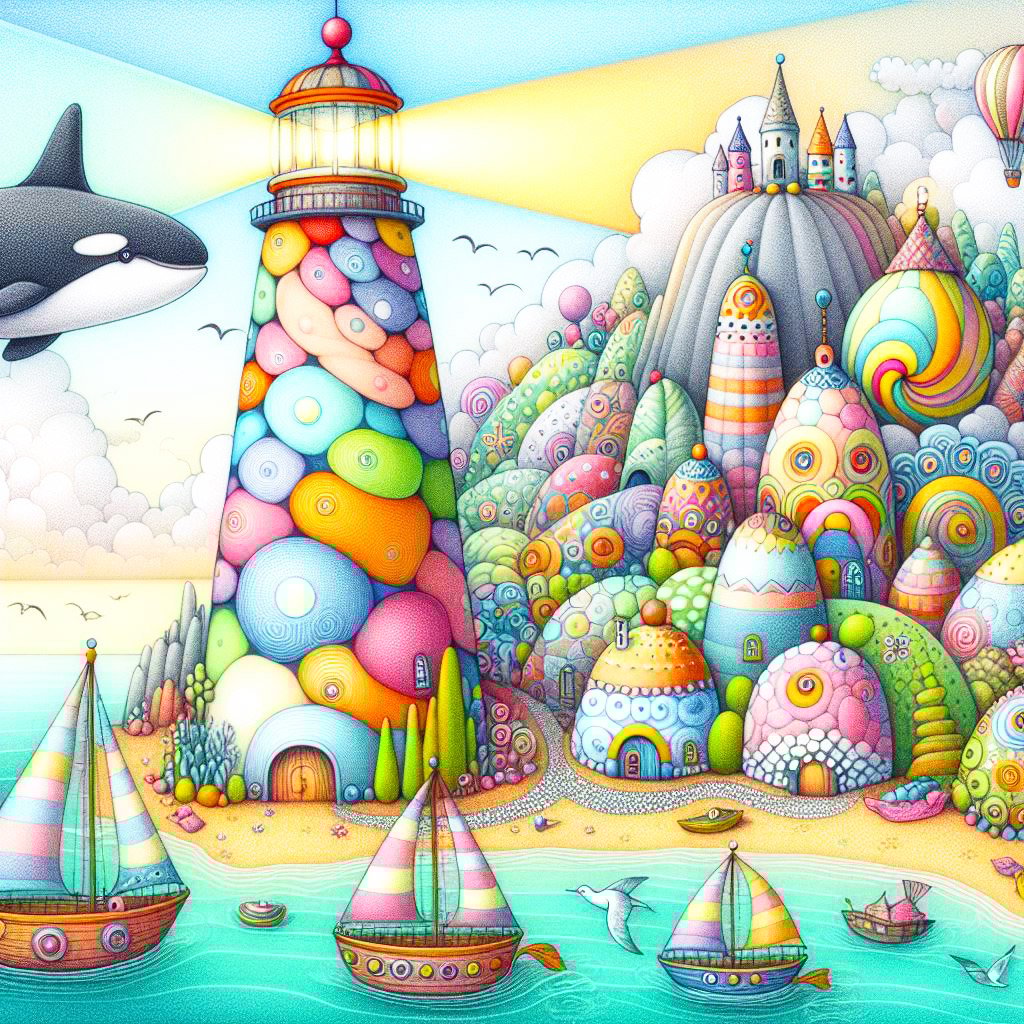 Colourful patterned lighthouse shining a light beam. Boats ride in a turquoise sea. There are whimsical houses made of swirly patterned marble on high hills There is a beach & there is a killer whale leaping from the water & seagulls fly in the sky. There is a hot air balloon.