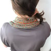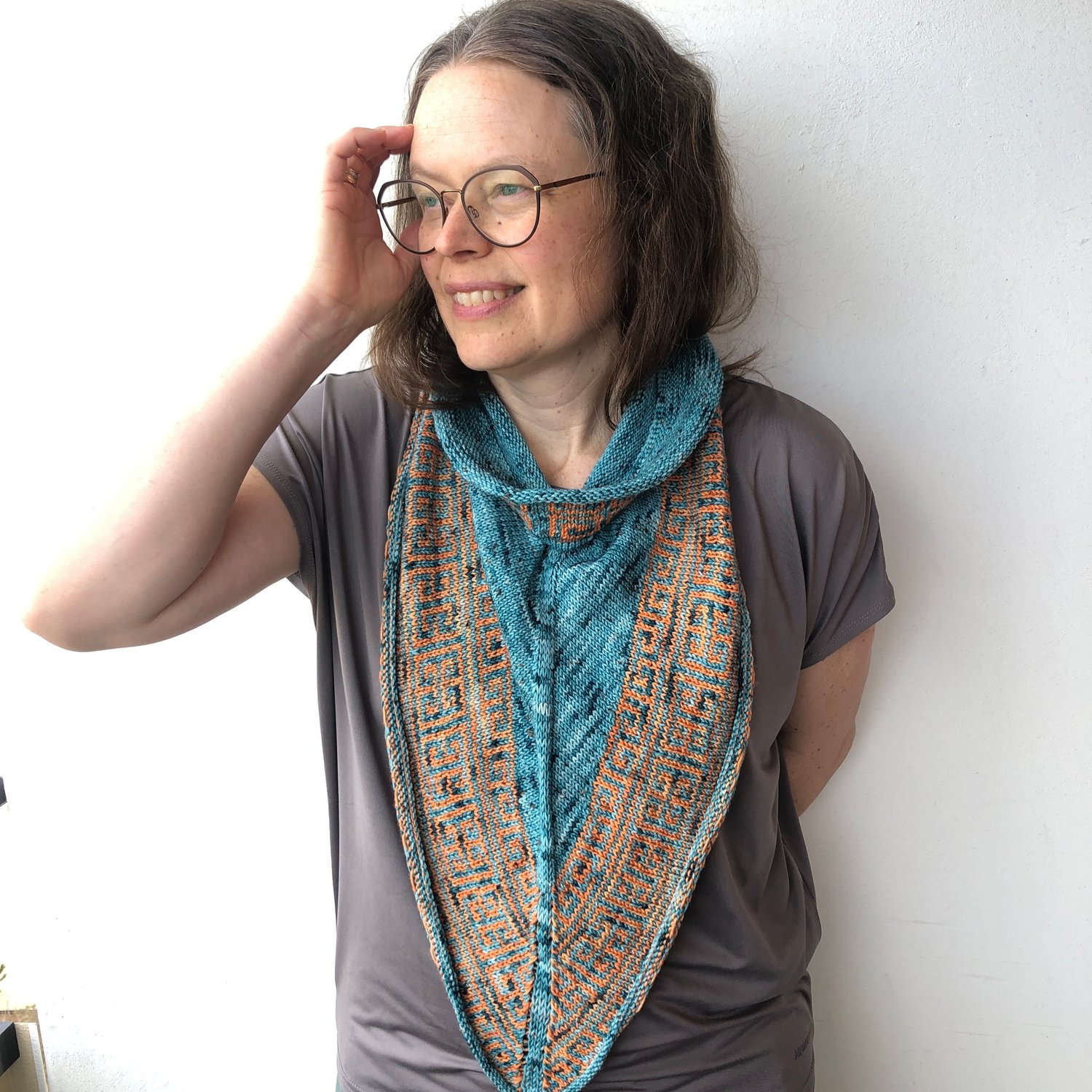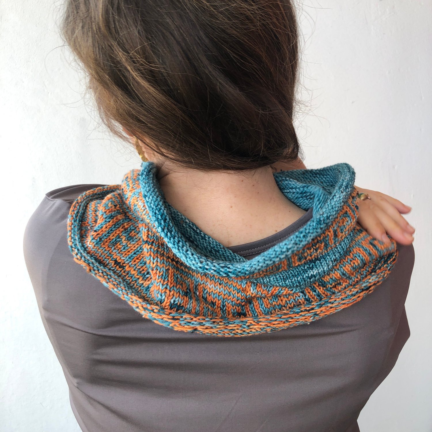 The cowls are worked bottom-up in the round, starting with some one-color stockinette, then colorwork while shaping the front, moving on to German short-rows in one color, finishing by working the collar and seaming it on the inside.