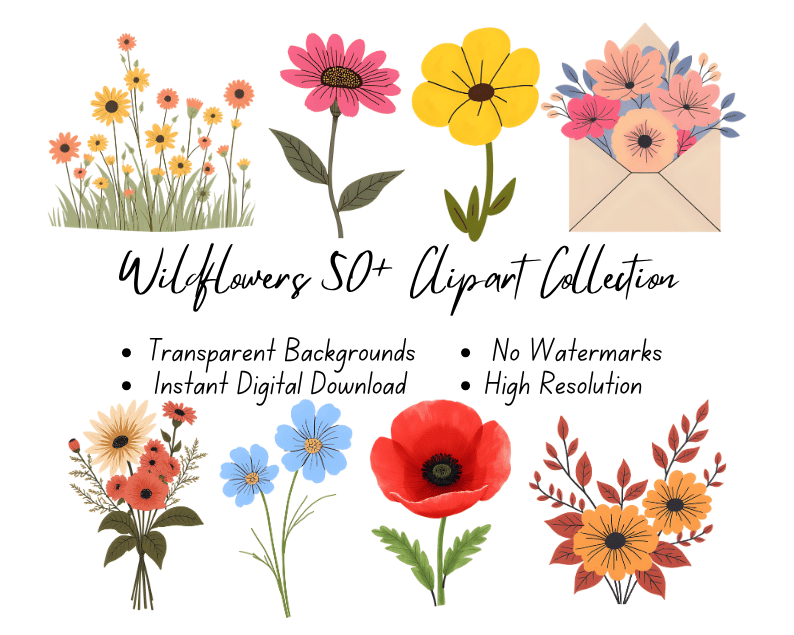 Wildflowers 50+ Clipart Collection | High-Resolution Digital Printables | Instant Download | No Watermark