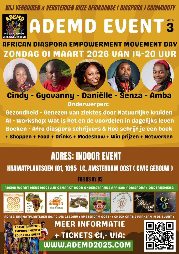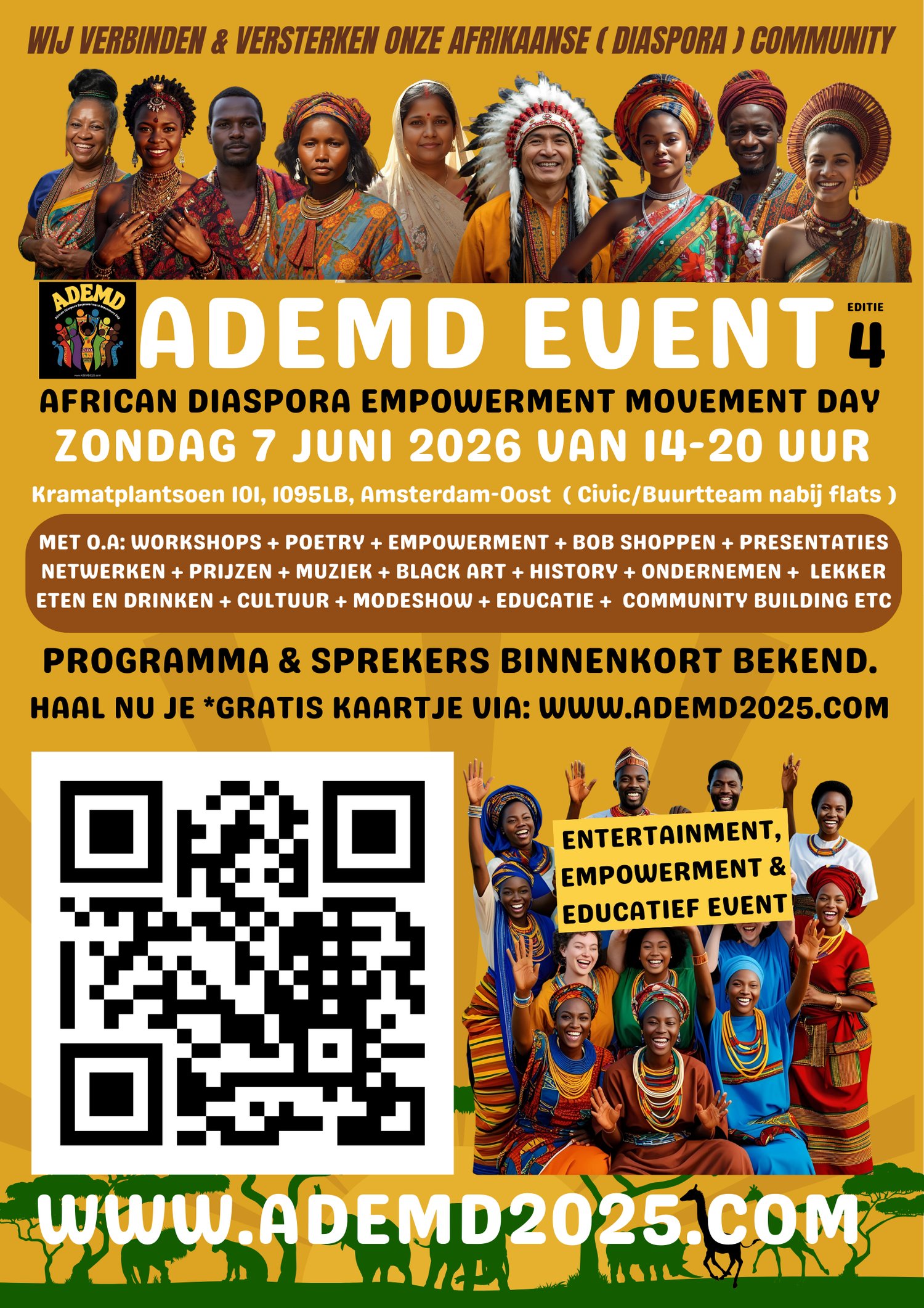 ADEMD staat voor: African Diaspora Empowerment Movement Day. Een event met entertainment, empowerment en educatie om de Afrikaanse cultuur te omarmen. Bekijk het programma op onze site: WWW.ADEMD2025.COM -